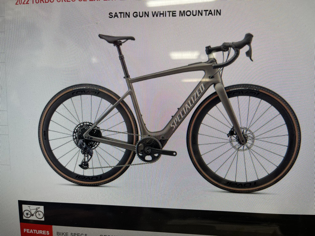TLDR; Ordered my first e-bike, a 2022 Turbo Creo SL Expert EVO XXL. So far it only comes in "Satin Gun White Mountain", now has SRAM eTAP AXS and 12 speed.