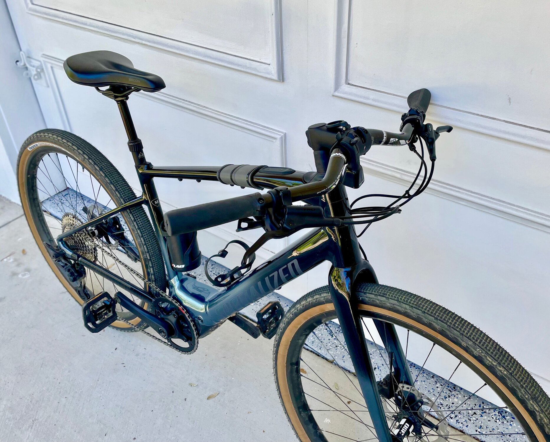 Thanks for the post. Also with a Vado 5 eq SL, in SoCA. I've also changed handlebars, pedals, seat, front light (mounted to side of fork with velcro/viola strap) raised handlebars, had new cables run to add length to allow a high handlebar (bad neck on my part). Anyway - When I went to change tires, the best I could do was to put pathfinders on the stock rims. I want to get ones similar to yours, but we couldn't make them fit. I think maybe I was not willing to give up the fenders, as I do appreciate them, it does rain even here :). I did remove the rubber bottoms on the fenders. I changed to tubeless. Have 3900 miles and not one flat! Ridden on dirt, gravel, road, and whatever else.... love it! Great bike. Am going to look into your tires. There is a You Tube about the different strengths of springs in the stem mount. There are three different ones. Soft, med, hard. I want to know what I had, but the LBS guy wasn't aware of it. Think I need to go to Specialized store. Where did you get your tires and rims? Do you think you could have made them fit with the fenders on?