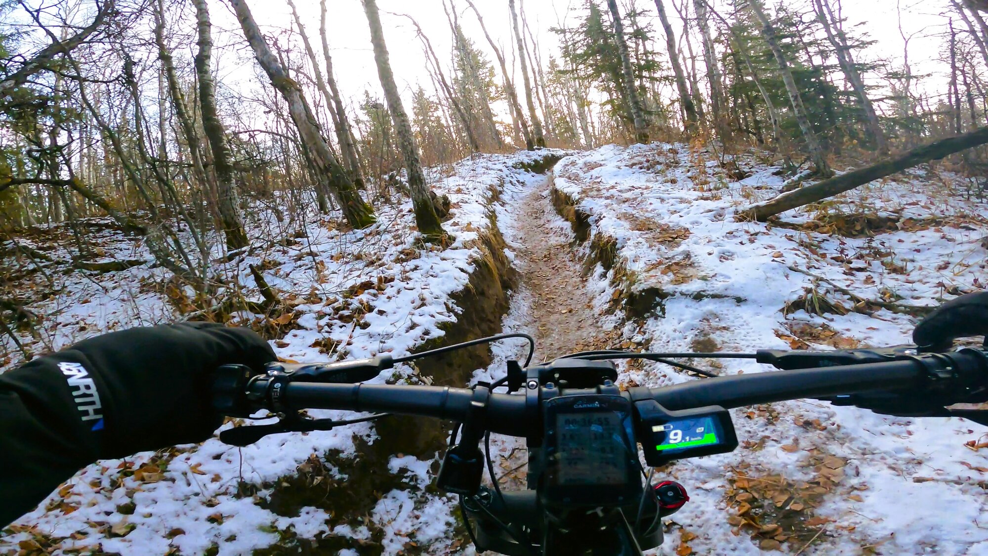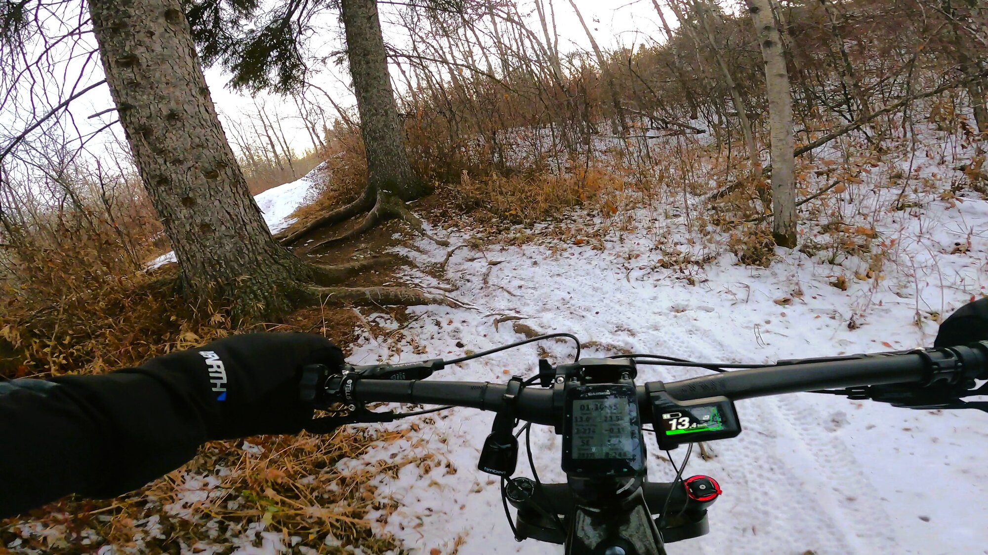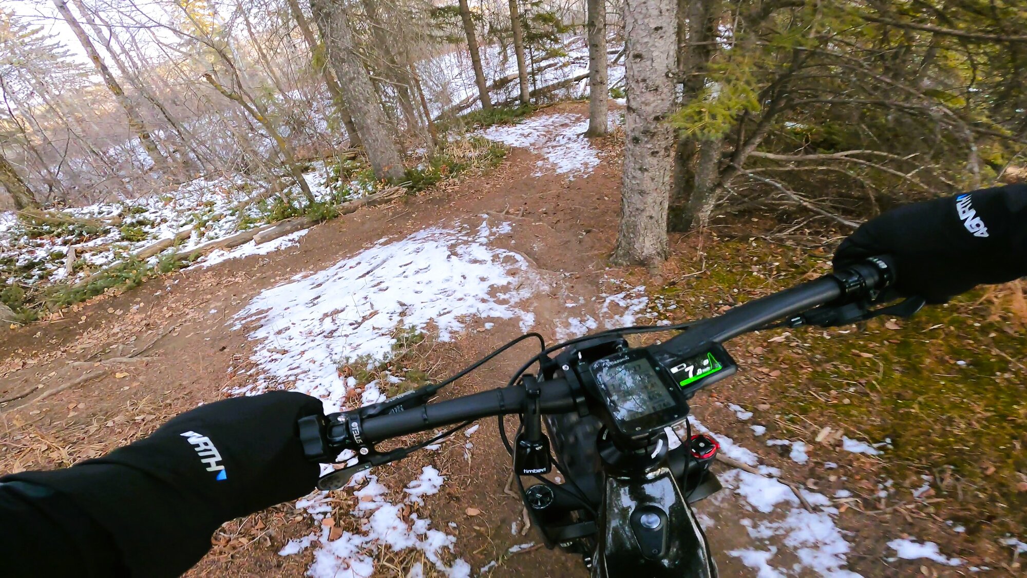 With the lack of snow, sections of trails are clearly readable allowing for safer passage down descents. Having spiked tires does help significantly but added caution must still be exercised without knowing what lies beneath cover.