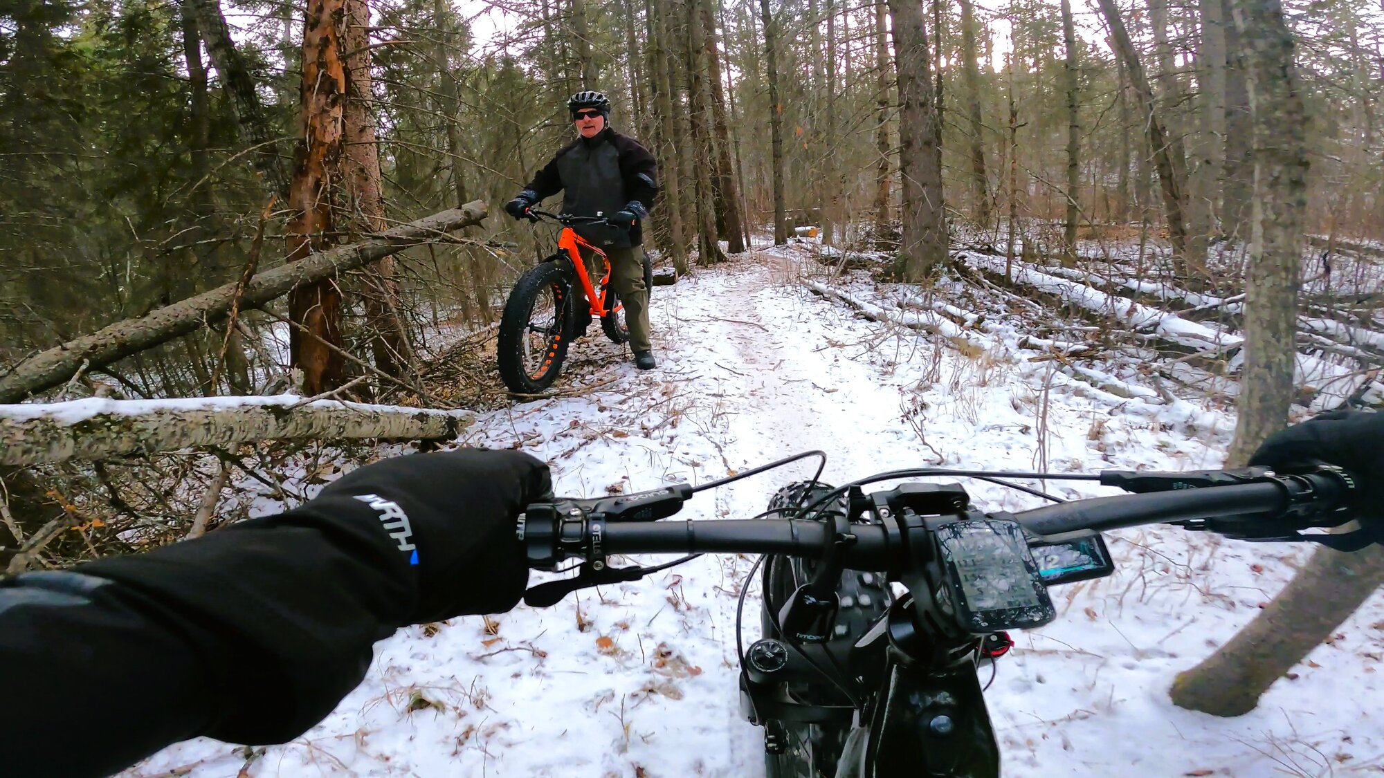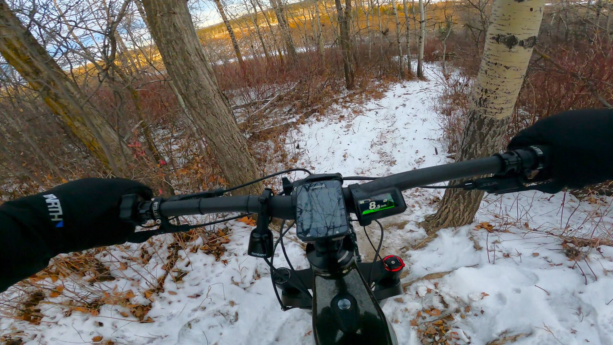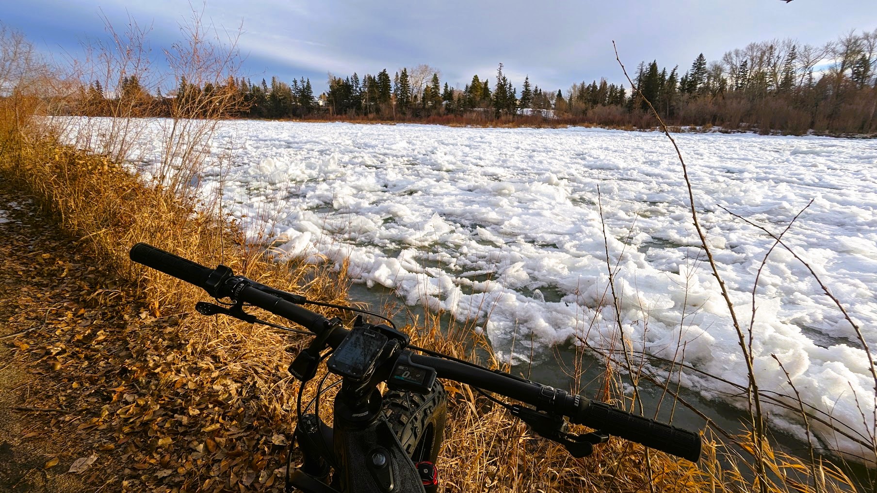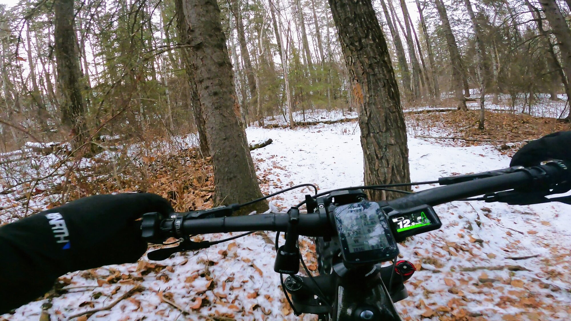 With the lack of snow, sections of trails are clearly readable allowing for safer passage down descents. Having spiked tires does help significantly but added caution must still be exercised without knowing what lies beneath cover.