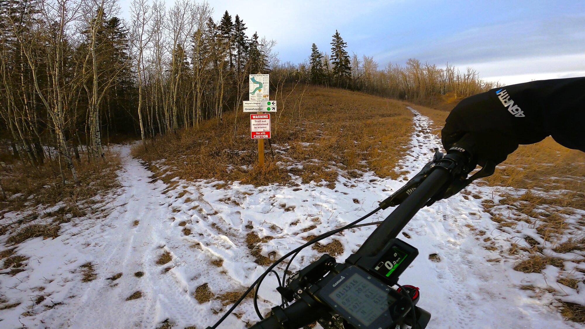 Arriving at the mtb park, I noticed a number of fat tire tracks leading me to believe that others had the same idea taking advantage of the semi-frozen ground conditions. Not ideal but totally rideable.