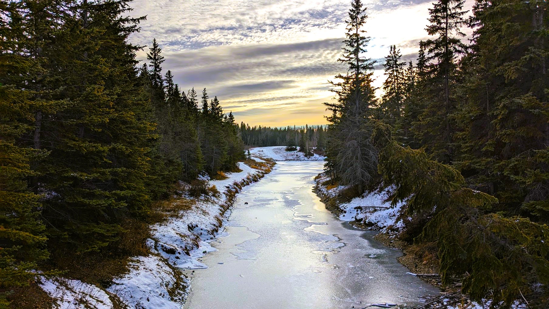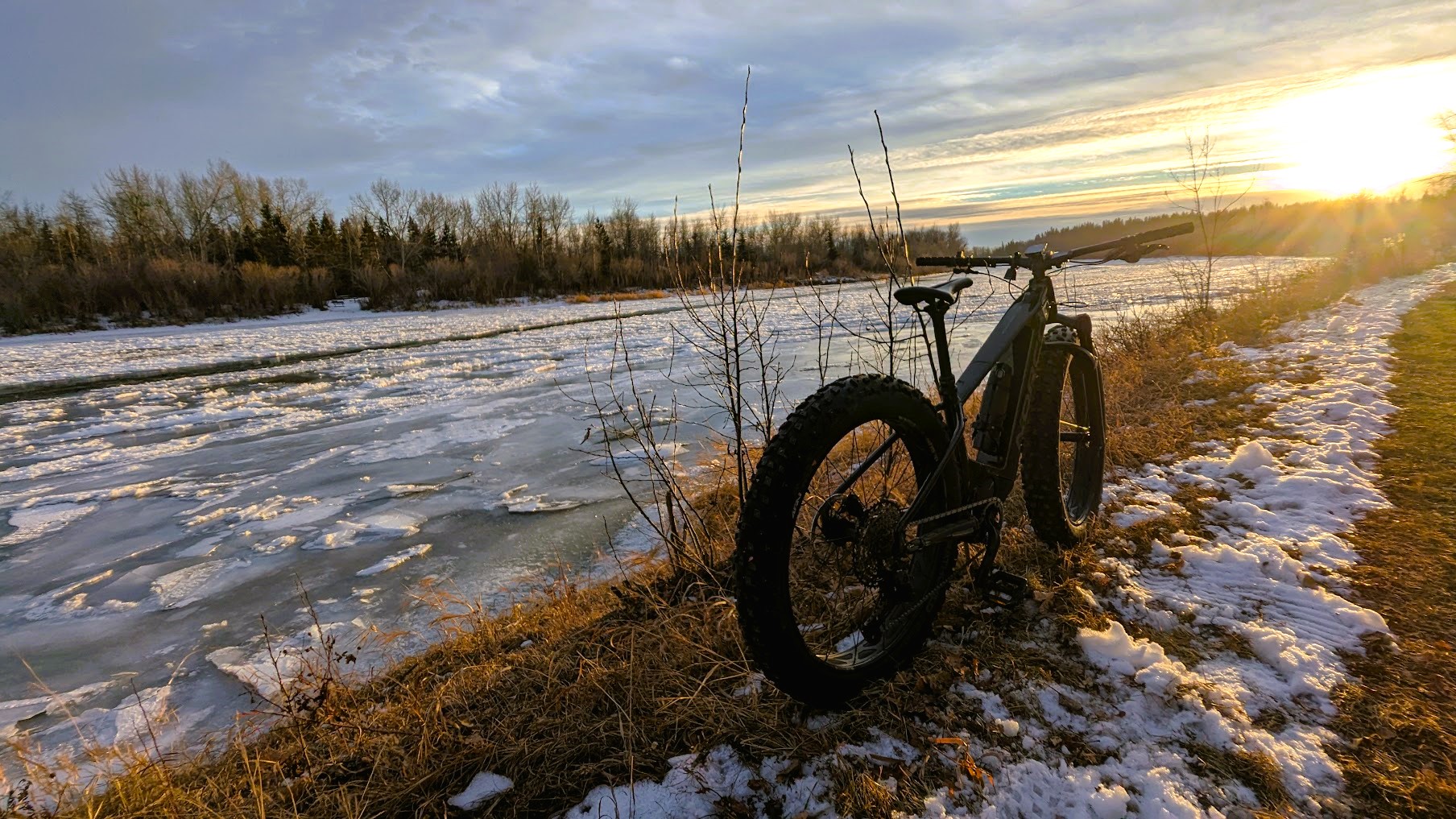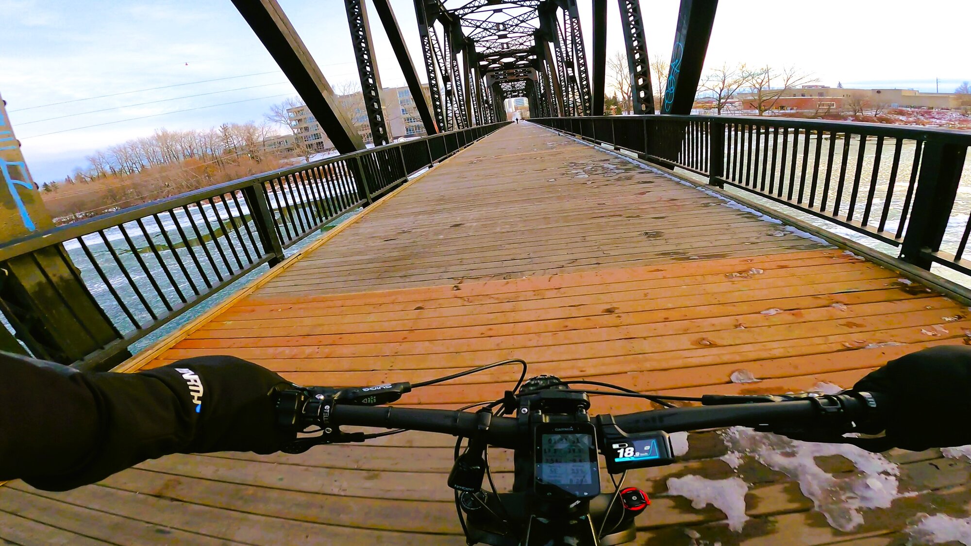 As sunset approaches, I head back towards home base along the bare pathway and across the converted CP rail pedestrian bridge near the end of my ride. This has me thinking that it might be a good time to head to one of the mountain parks for a much-needed change of scenery.