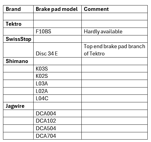 I chose the SwissStop brake pads. Note: I copied the Shimano compatibility from SwissStop website; please verify visually before you buy!