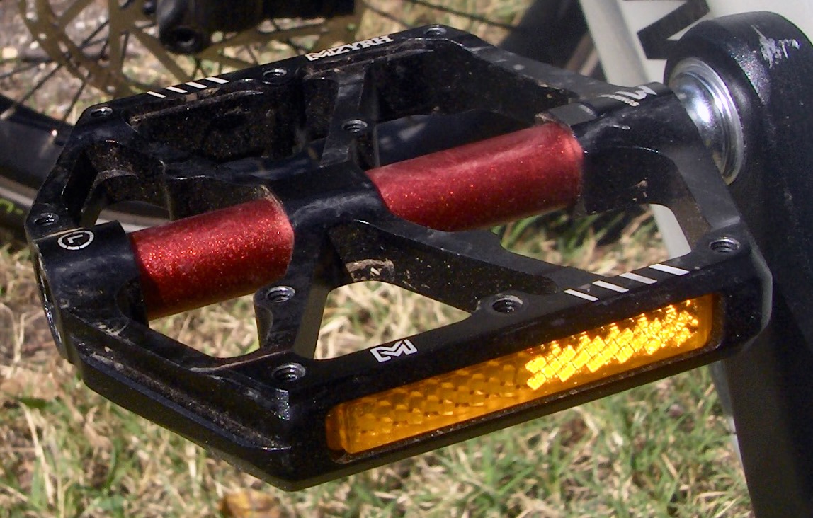 Unlike the resin pedals, the metal ones began to click after a thousand miles. I wanted to replace them anyway. I'd noticed that my feet tilted outboard because the pedals didn't extend far enough from the cranks to support the width of my shoes. I chose the red metal ones because they gave me wider support, had 3 rows of ball bearings, had reflectors, and had removable pins. Slipping had never been a problem with block pedals. I could unscrew the pins on my new pedals to test for slippage. If it wasn't a problem, I'd have safer pedals that would make it easier to reposition my feet.