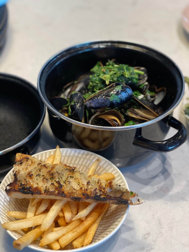 You had me at “pot”. Yum yumThe pot of Moule Frites is nice after a ride. It is done in white wine, butter, steamed with fennel and parsley with onion. The nectar is to die for, you dip the toast in it. Then slurp the juice up not too rudely by pouring it into a cup. Shells go into the lid to the left. That is how to get muscles.