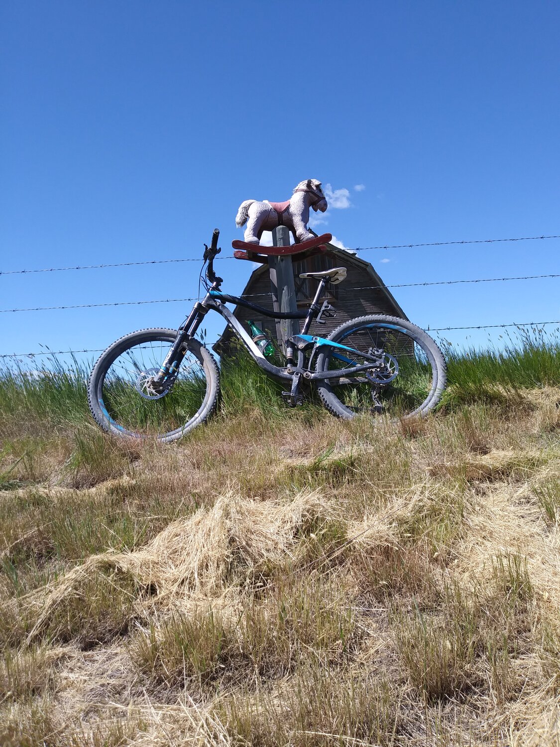 I have seen ball caps attached to fence posts sometimes accumulating a quarter of section of posts but this was a first - at least 40 rocking horses attached to successive posts, must be a story there somewhere, today I had the old giant trance regular mtn bike out for its first ride since moving on to the e-bike world and it was a good ride - however, I hope the e-bike gets its electrical problem sorted out at the local bike hospital soonView attachment 59398