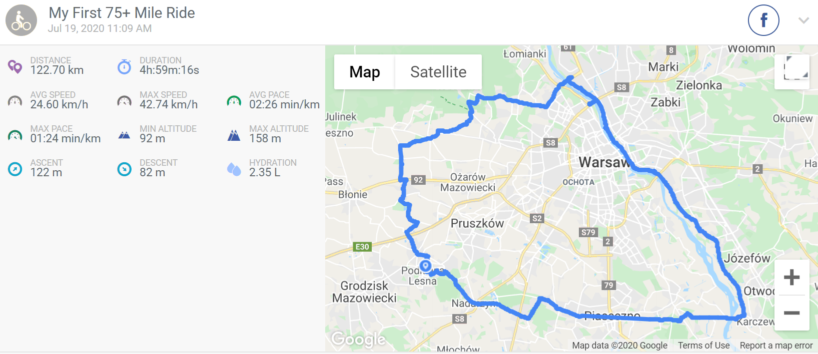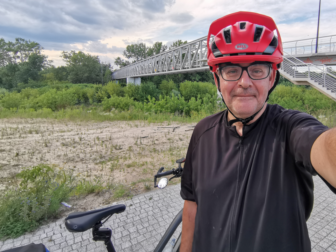 Nearly 50 miles completed! (You can see how tired I was). It was one of my favourite Warsaw places, the Żerań Cycle Bridge (over the Royal Canal), with a nice round square :) for taking a rest comfortably.