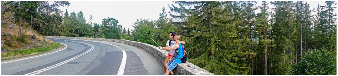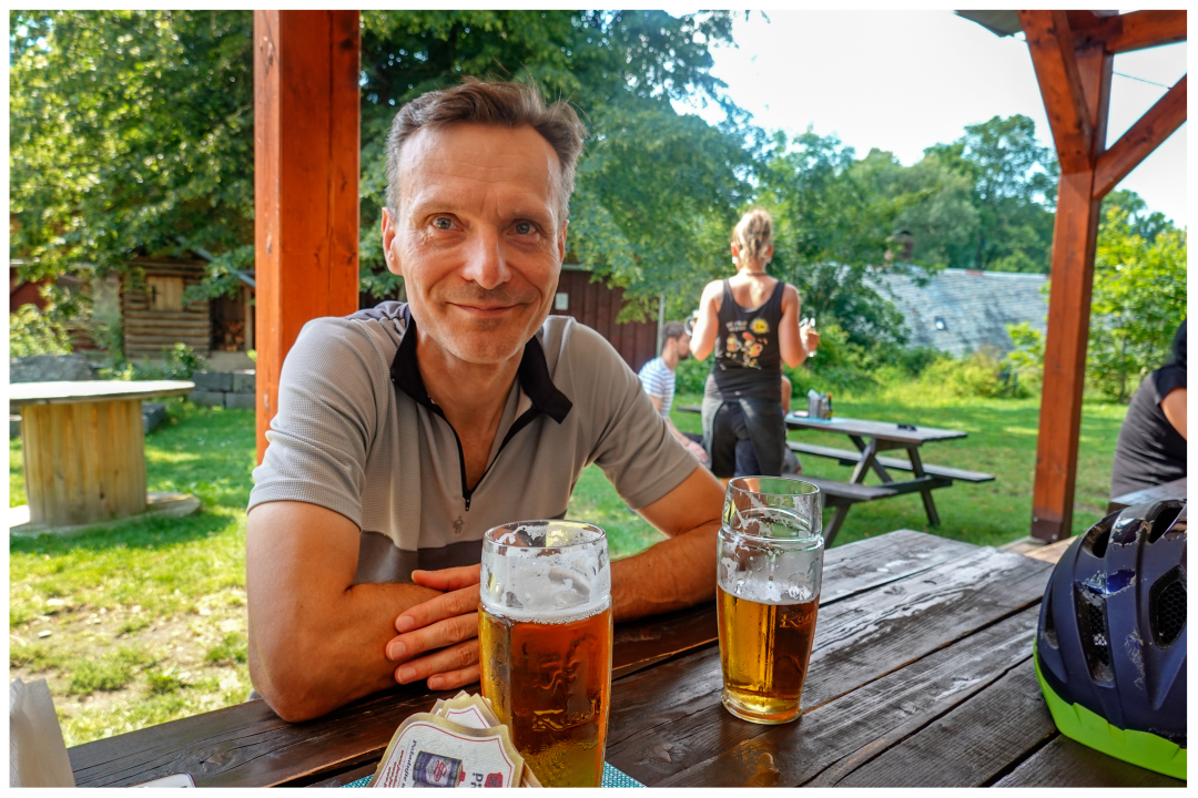 At the famous Vang Stave Church (more about it later). On the approach to Karpacz, we had two options to ride up the church: Jacek chose the hiking path! That was funny! We bypassed a barrier and took a dramatic, steep climb, only asking pedestrians to step aside