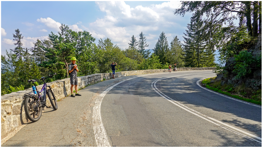"Still 4.5 km of ascents?!" -- I was panting -- "Let us make a short break here!" -- I requested. The road-cyclist disappeared uphill (he was a young competing racer on a workout). We spotted a lady on a US$1200 e-bike there. Well, well, well, e-bikes are really becoming popular here (we could see more e-bikes there, too). It has to be noted all other cyclists seen were taking the easier route.