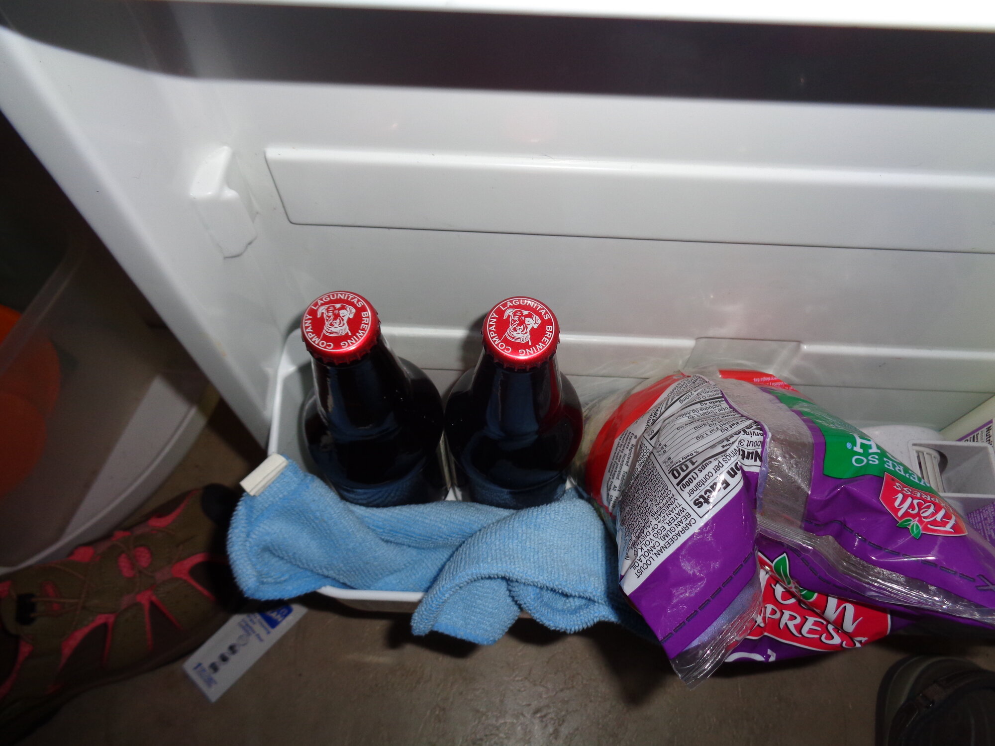 Then, on the way back my body started protesting. My bum was not liking the seat I put on this bike, my shoulder started hurting and I just felt beat up. That's how it goes on the Radmini. 12 miles feels like 35 on the Gazelle, or worse. Luckily, back at camp, there was liquid medicine for this. The little trailer has a very good fridge in it. The beer is old, but still good.