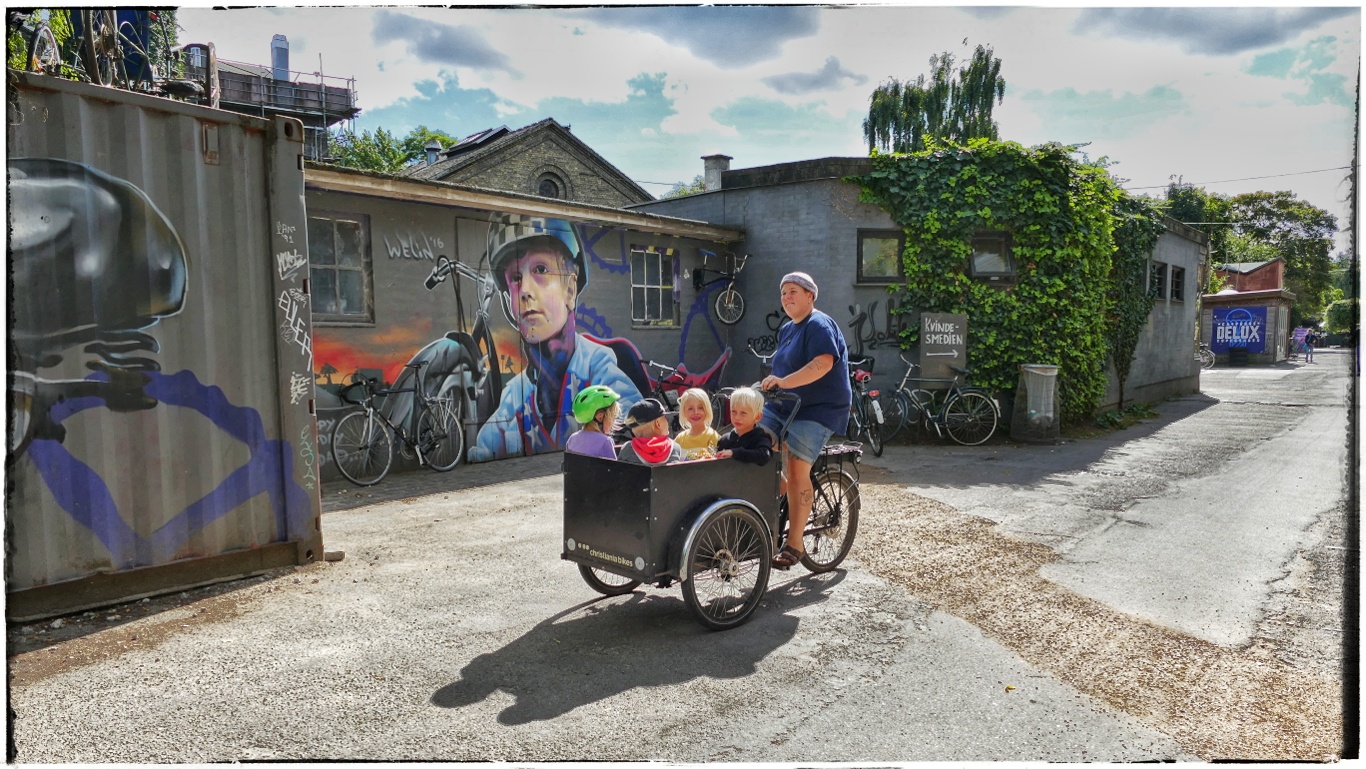 Freetown Christiania, the famous hippie, green, alternative commune of Copenhagen since 1960s. Quite iconic cycling picture, isn't itDanes love cargo bikes. We could see a girl carrying not only her dog in a cargo bike but her hubby, too