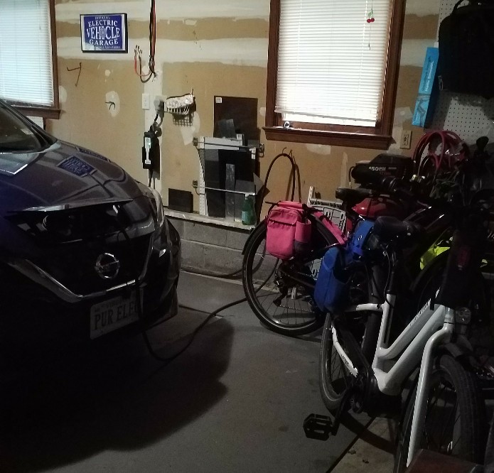 Sorry about getting off topic talking electric cars on an electric bike forum. So here is a pic of my e-bikes parked next to my e-car, all happily charging up their respective batteries in the comfort of my own garage. They each have their own outlet, too.