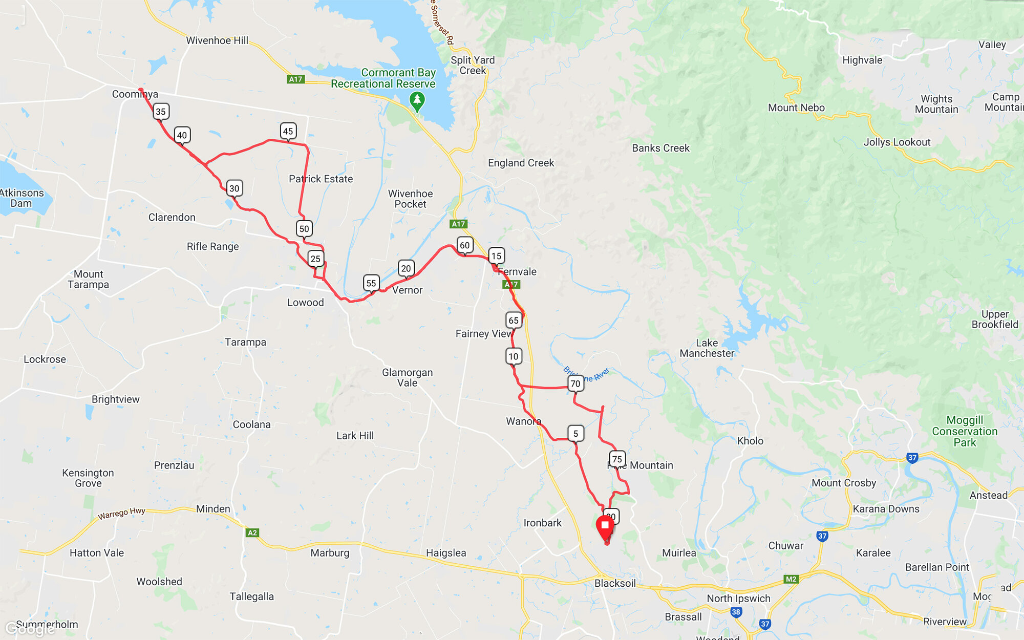 If you look at the map between 70 and 75 km, you'll see how I detoured up the cows' road to take their photo. Maybe, they'd heard that I'd stopped in Lowood (52 km) for a milkshake.