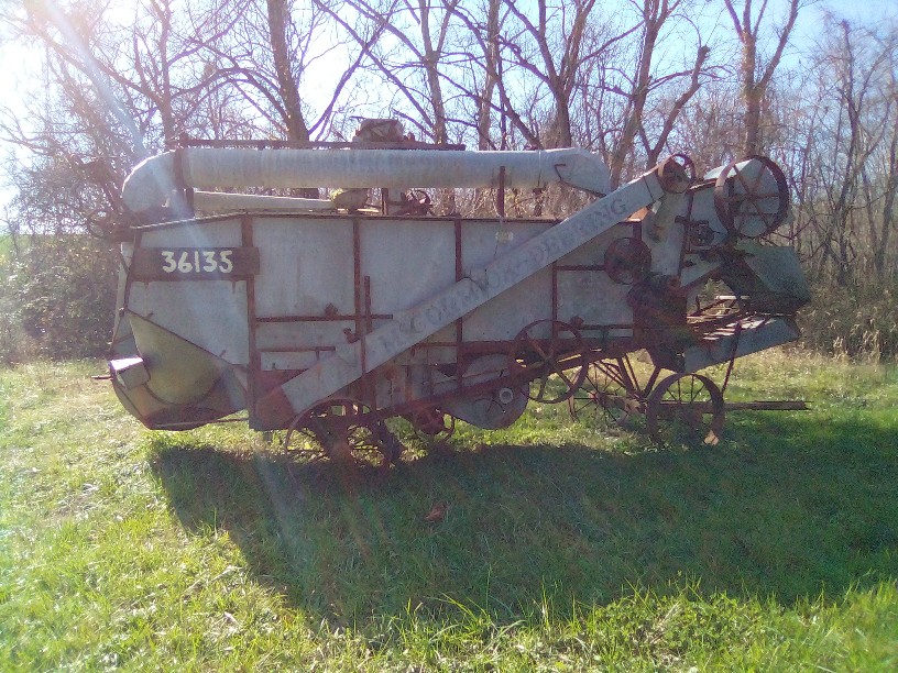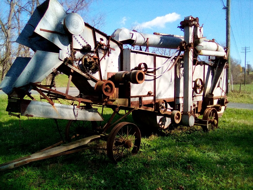 As a little boy around 1955 I remember 'threshing time' at grandpa and grandma's farm in Kansas. Grandma had a table that telescoped out to 12 feet long and it was covered with every kind of food as you would expect for a grand Thanksgiving meal. And every chair around the table was filled with the threshers. Men who traveled from Texas all the way to N. Dakota following the wheat harvest as it ripened. Of course they were using combines by then but everyone still called it threshing and the men were threshers.Looks like a McCormick horse drawn thresher. McCormick Harvesting Machine Co became International Harvester in 1902.