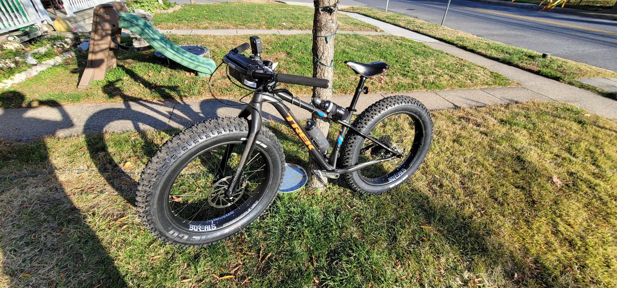 The bike has a Suntour NCX suspension seat post as well as studded tires, so was prepped well for the conditions.