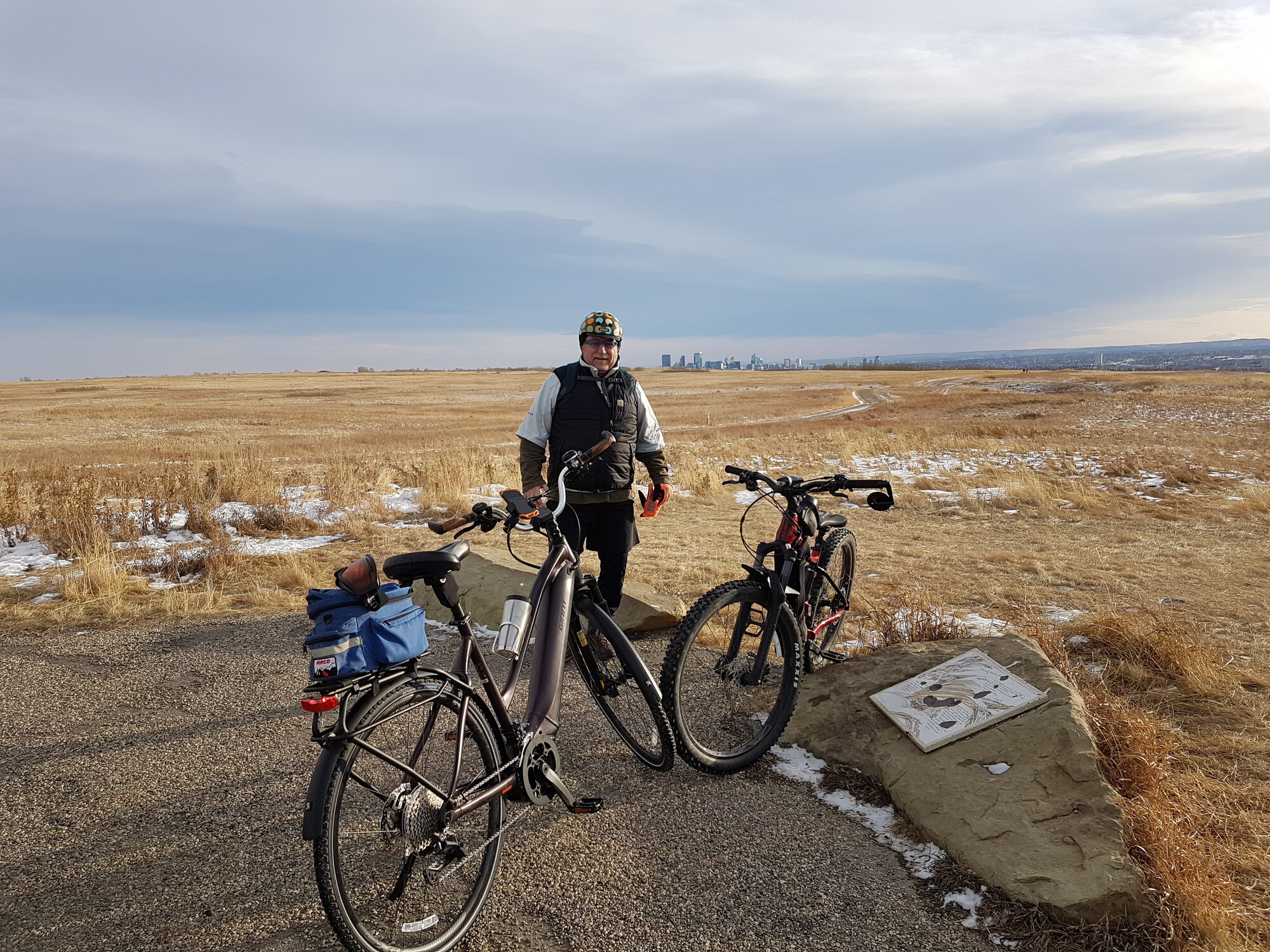 On Nose Hill Park itself, we rode the paved and unpaved wide pathways (both clear and snow and ice covered) , as well as some single and dual track trails (mostly snow covered).
