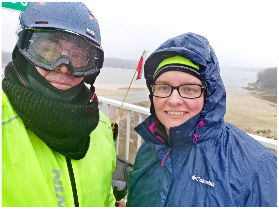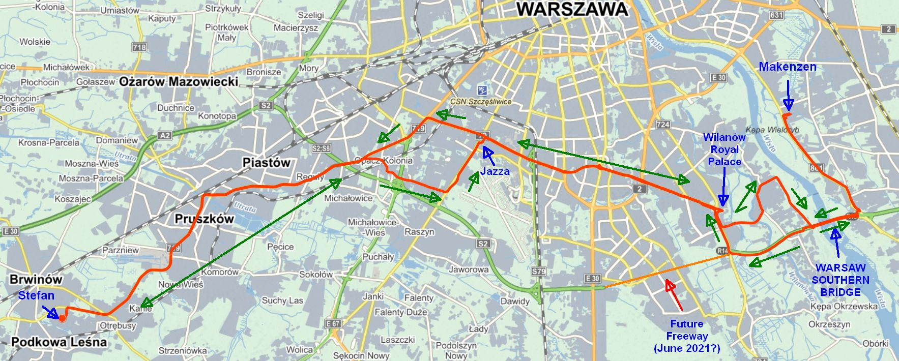 The weather was getting worse and worse! From constant raining to the downpour, combined with strong wind and cold. Below the bridge at the Wilanów side, I had to fix the saddle and had an "S-Pedelec talk" with a group of construction workers (only Poles, and a single Ukrainian). The number plate on my Vado certainly attracts attention!