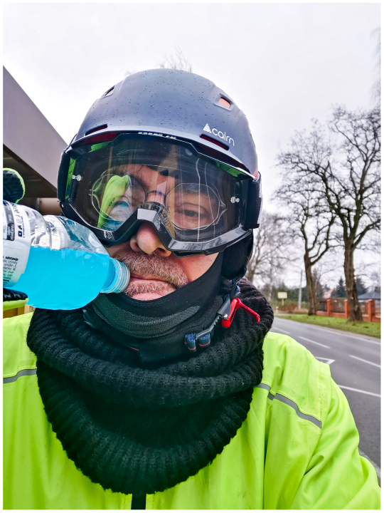 After passing Łoś, I hit the 8000 km yearly mark. Celebrating the achievement with OSHEE, a Polish sports drink (the ZERO version).