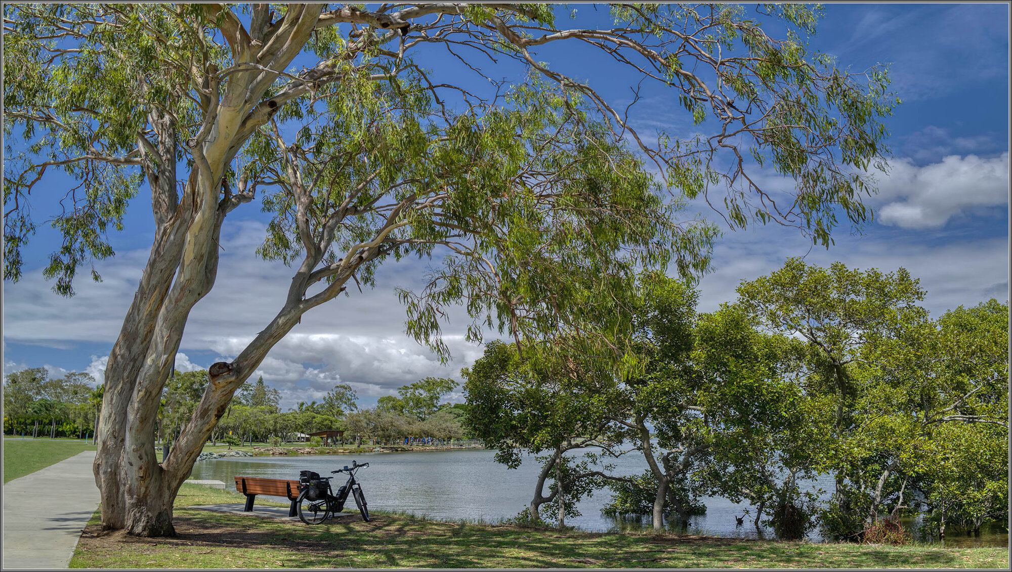 Revisiting some old favourites was what I did today. The bike path on the left is the Moreton Bay Cycleway and the bench is a perfect place to take a break. Today it was at 50 km, my turnaround point. It was perfect weather for an ebike ride along the coast!