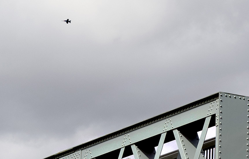 The furthest point from home was the Lockyer Creek trestle bridge (47 km – been there before!) where I'd leave the road for the rail trail. Several F/A-18F Super Hornets roared in from the east about four kilometres beyond the bridge. They'd were be back at RAAF Amberley Base in five minutes or so; I'd take over two hours. The Super Hornet is the black dot against the cloud towards the right end of the girder section of the bridge (see crop below).