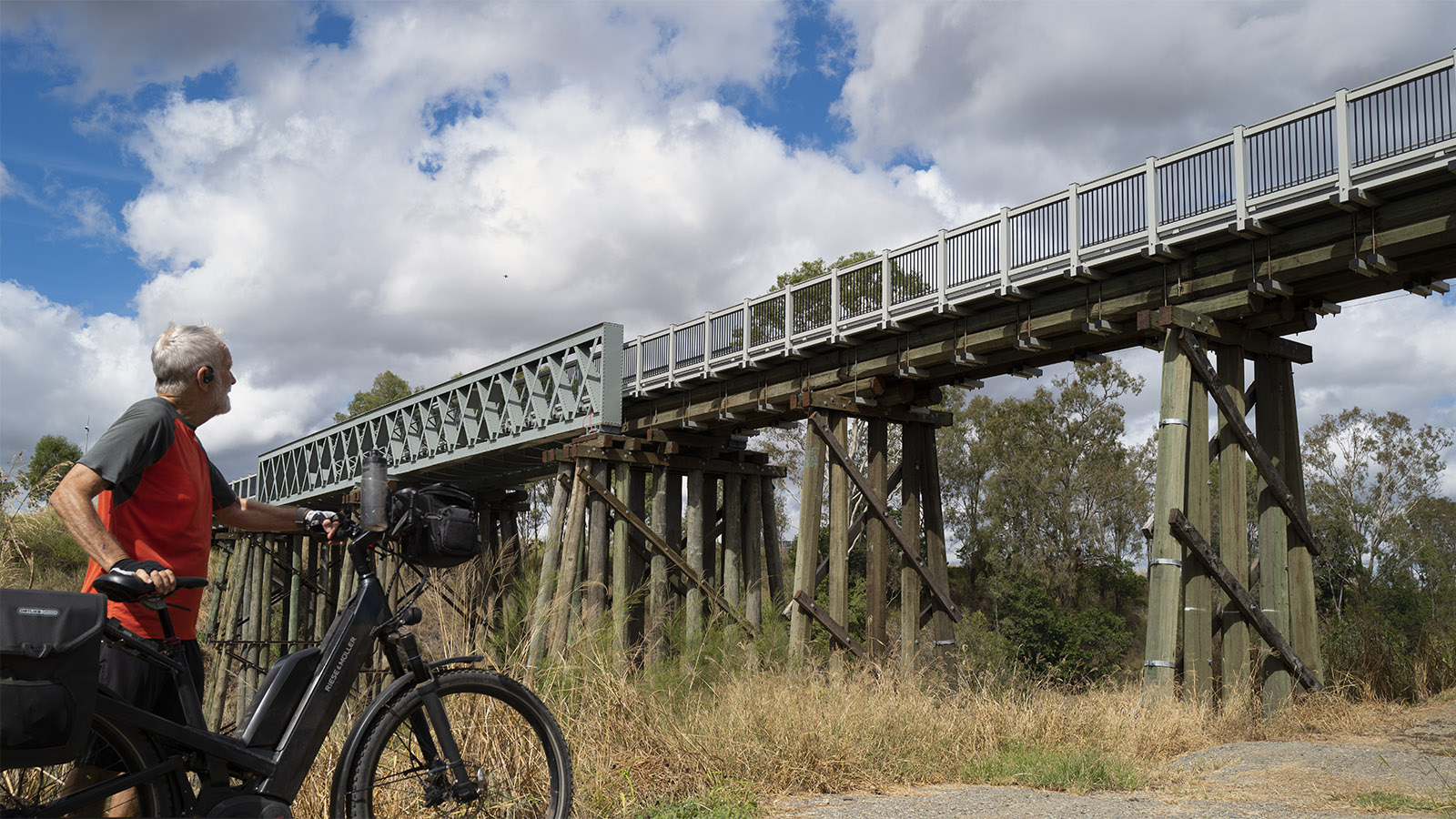 The furthest point from home was the Lockyer Creek trestle bridge (47 km – been there before!) where I'd leave the road for the rail trail. Several F/A-18F Super Hornets roared in from the east about four kilometres beyond the bridge. They'd be back at RAAF Amberley Base in five minutes or so; I'd take over two hours. The Super Hornet is the black dot against the cloud towards the right end of the girder section of the bridge (see crop below).