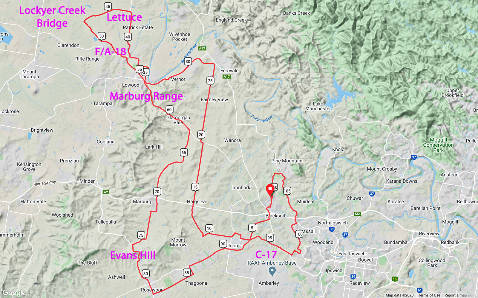From Rosewood (82 km), at the base of Evans Hill and left of my Homage in the above photo, I headed for Ipswich, being careful once again to avoid my outward journey. A lone C-17 Globemaster was practising landings as I passed the Royal Australian Air Force Base at Amberley (90–95 km).
