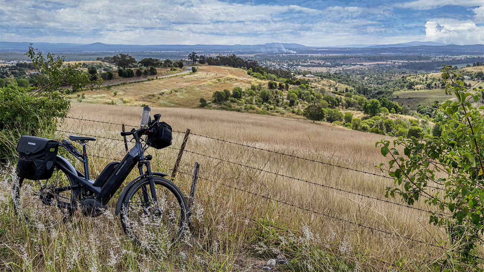 After 15 km along flat roads, it was time to climb Evans Hill for a view south towards the New South Wales border. These minor ranges, and the winds when they are contrary, are cancelled out by an ebike's generous help. I couldn't be out here enjoying myself without an ebike, probably wouldn't be out here not enjoying myself if I still had to rely on my own strength.