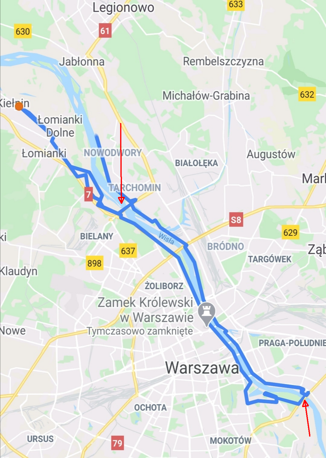 The arrows indicate the most apart Warsaw bridges.