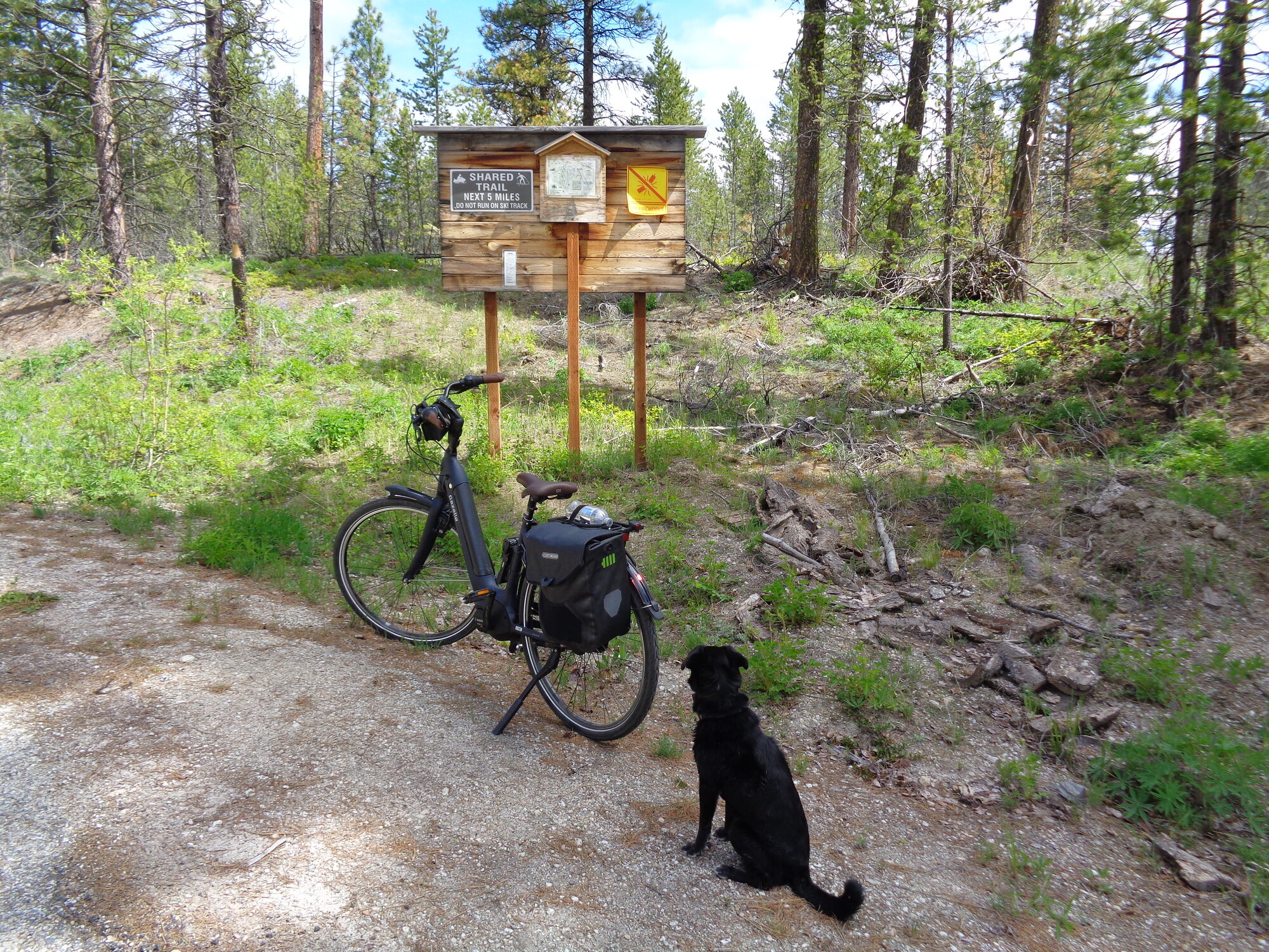 The unplanned plan was to ride leisurely and stop and rest the Demon Dog frequently. However, the Demon was not aware of the plan and took off like usual, veering off to terrorize the chipmunks, mice and microbes in the area. I beeped her back onto the road. She wears an E collar and a beep is usually all it takes to stop the terrorizing and get back on the road.