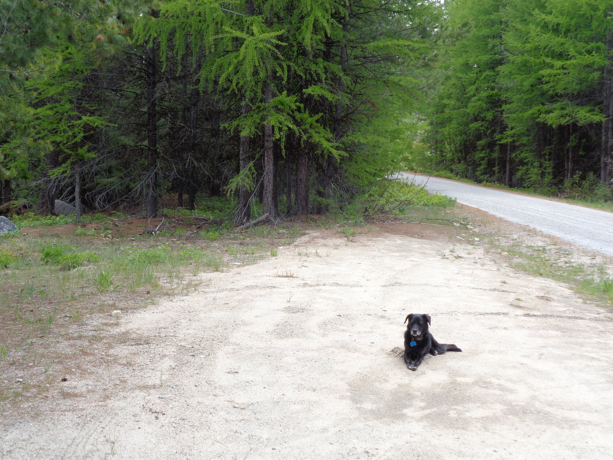 On the way back, another stop to "rest the dog" and eat my peanut butter sandwich. As you can see, the dog is truly resting. While stopped here, a pickup went by with the bed full of happy people. They waved, I waved. Not too bad.