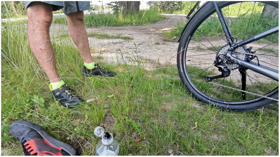 The town of Serock (where River Bug joins the Narew) is just beautiful; of course not a single photo taken there... We rode downhill to take some ride along the lake's shore. There is a short and fairly easy technical bike trail there, yet my Lovelec was no match even for that. Suddenly, I saw a dangerous downhill segment ahead. Panicked, stopped hard, and the bike started falling... "No way I let me fall again!" I thought in a millisecond. I jumped from the bike, and the bike fell alone. The day saved!