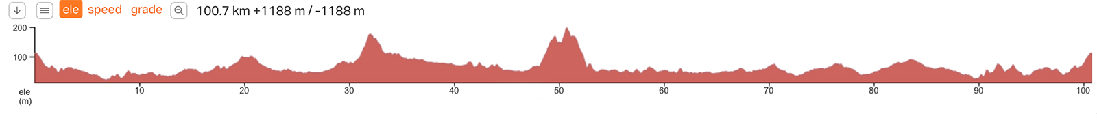 - 100 km : Every ride from home starts with a downhill zoom and ends with an uphill slog!