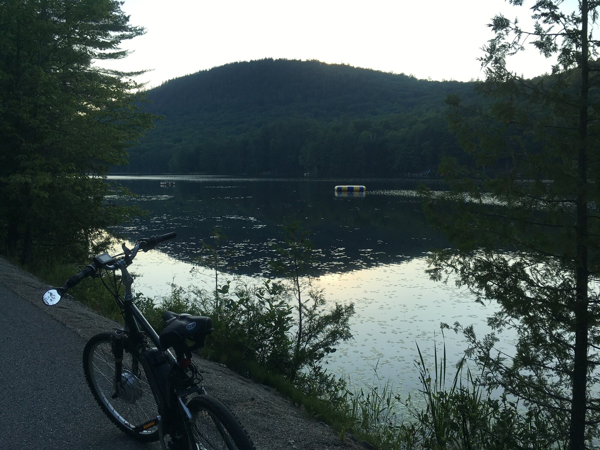This evening I rode up to Beaver Pond, also in the Adirondack Mountains. No motorized boats allowed. The road up there is riddled with potholes, which make for some interesting maneuvers. In the second picture the sun is just behind the mountain, hence the darkness.