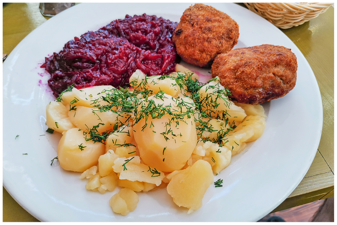Pork meatballs with potato and cooked red-beet is Polish staple meal. The restaurant has also a great choice for the vegetarian.