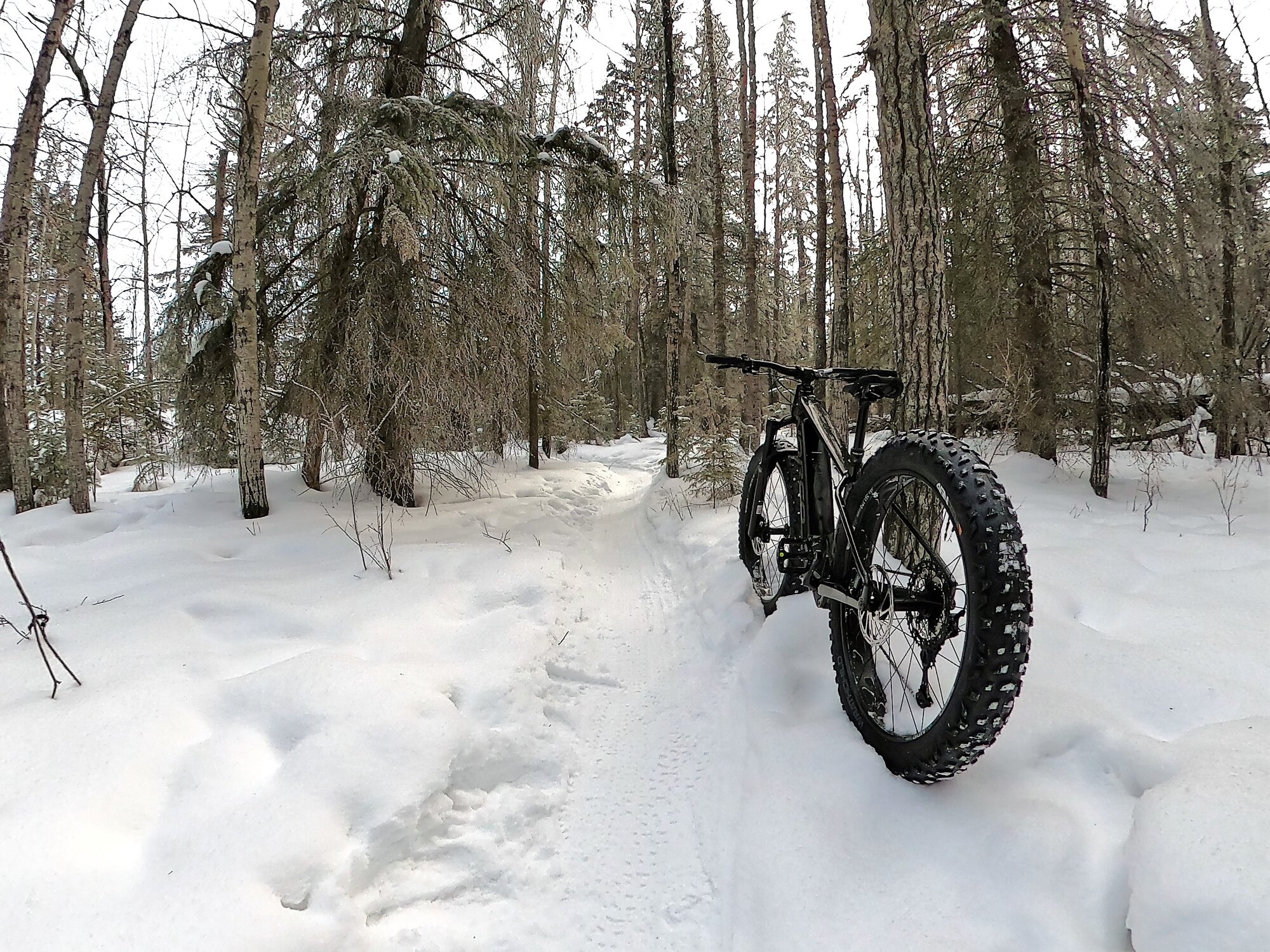 Yep, that obvious, eh? It’s a VLT 1 with the 900 Wh battery option shod with 27.5 x 4.5” 45Nrth studded Wrathchilds. I took off from the LBS for a shakedown run and headed to the nearest trailhead. Temp was -11C under foggy conditions which created a lovely coating of frost on the trees.