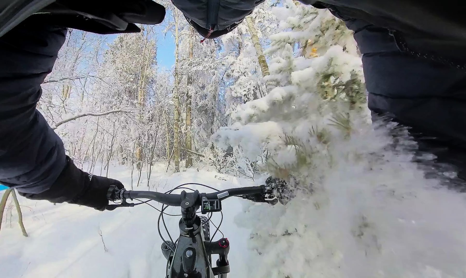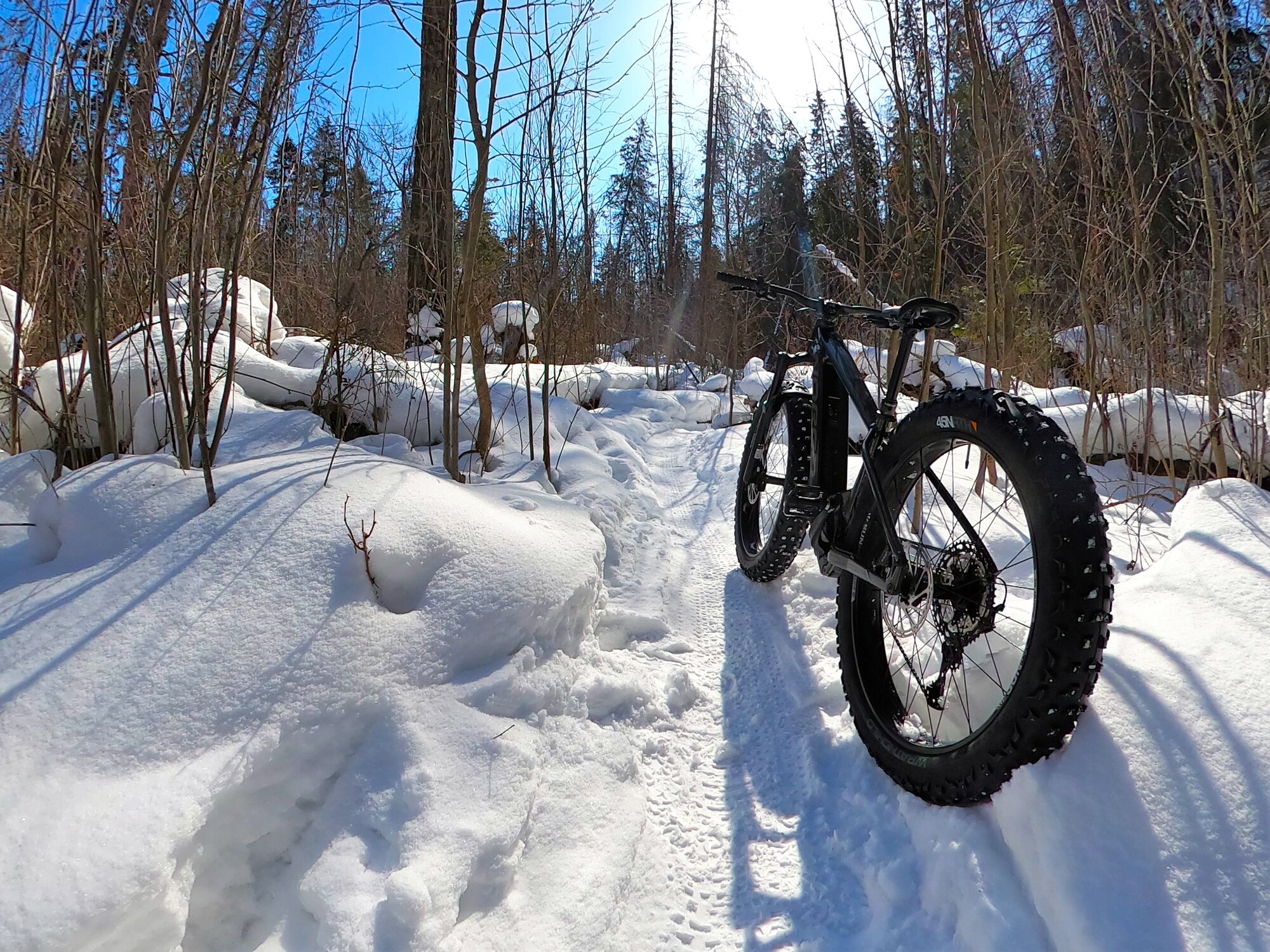 Yep, that obvious, eh? It’s a VLT 1 with the 900 Wh battery option shod with 37.5 x 4.5” 45Nrth studded Wrathchilds. I took off from the LBS for a shakedown run and headed to the nearest trailhead. Temp was -11C under foggy conditions which created a lovely coating of frost on the trees.