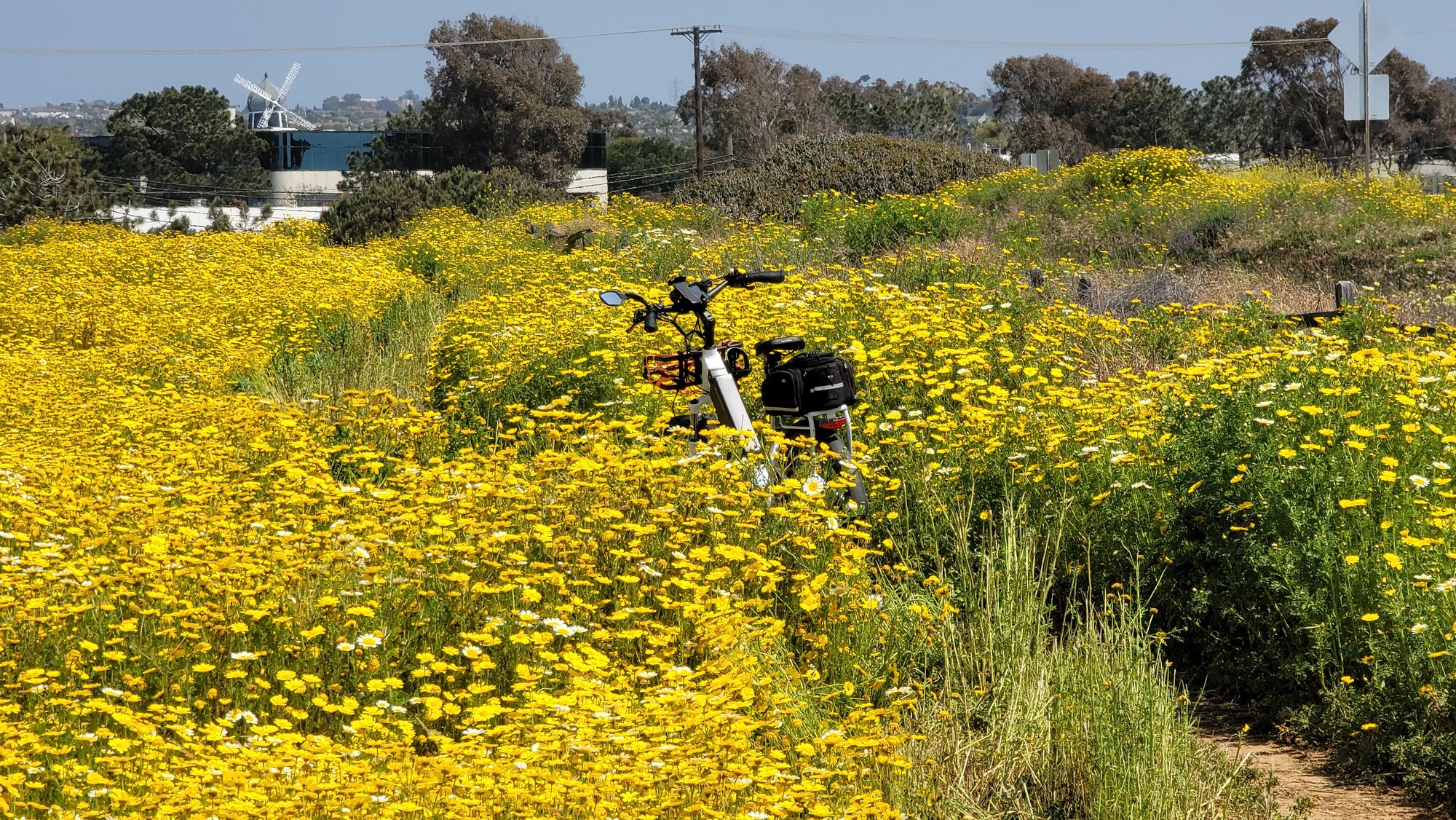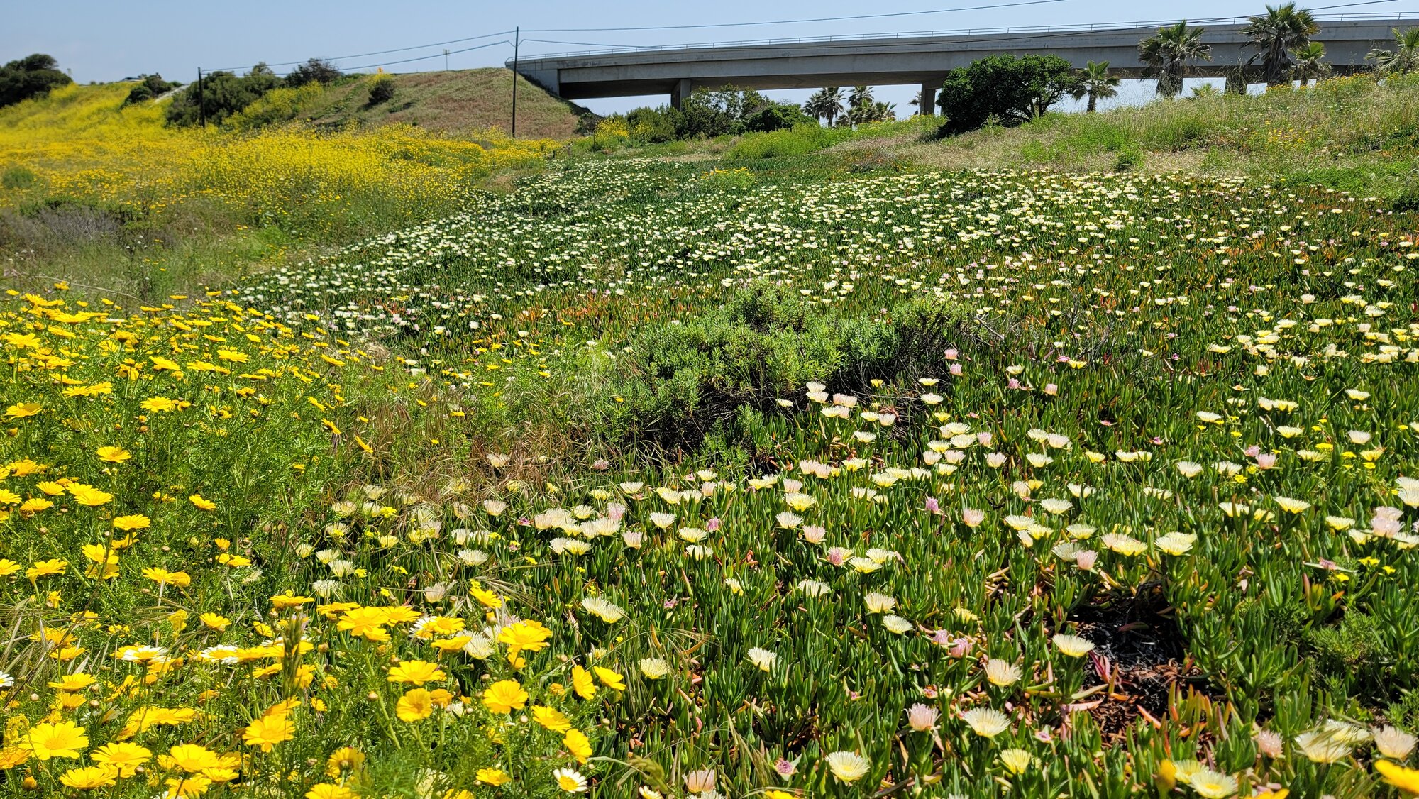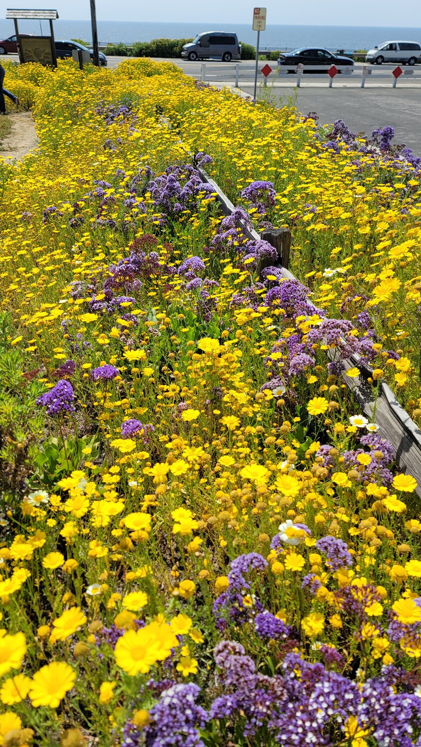 Thanks to our unusually wet winter, SoCal is now bonkers with wildflowers. The Carlsbad area near my home is awash in bright yellow with purple accents, as you'll see. Though not a "superbloom" in the techical sense, that's what everyone's calling it, and so will I. Per NASA's Earth Observatory, the true superblooms of orange poppies in our eastern deserts are even visible from space: