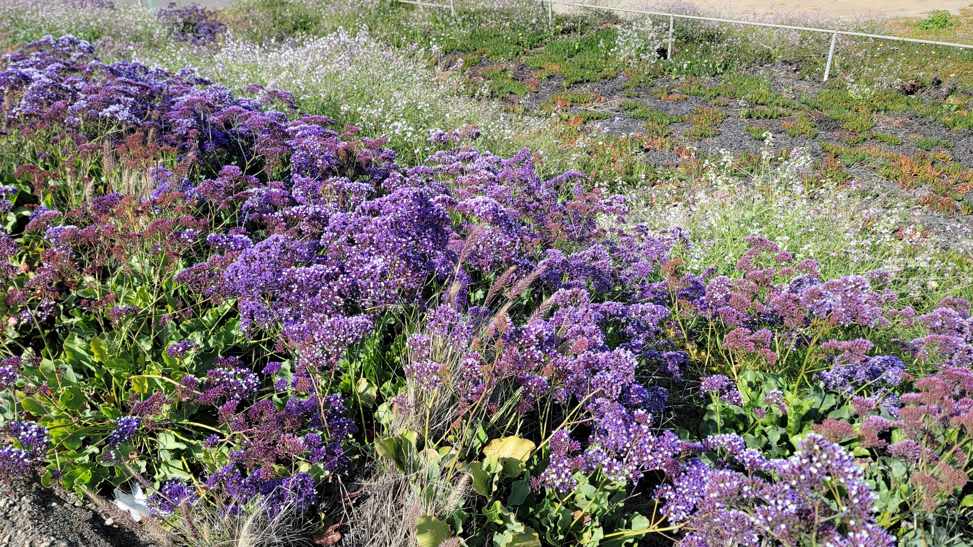 UPDATE: Per the PictureThis plant ID app, the yellows are crown daisies, and the purples, sea lavender.