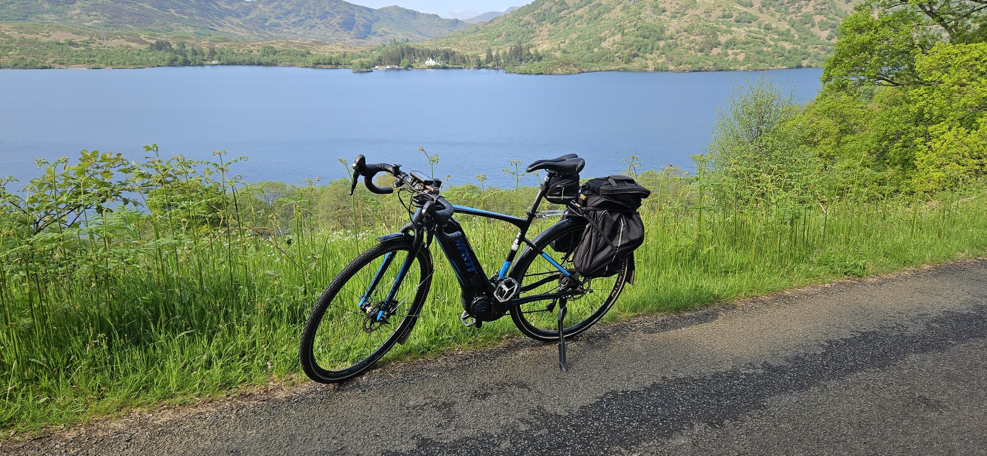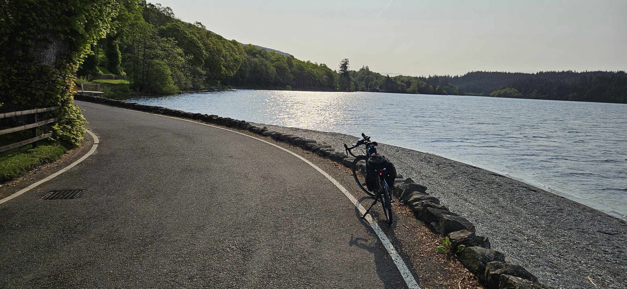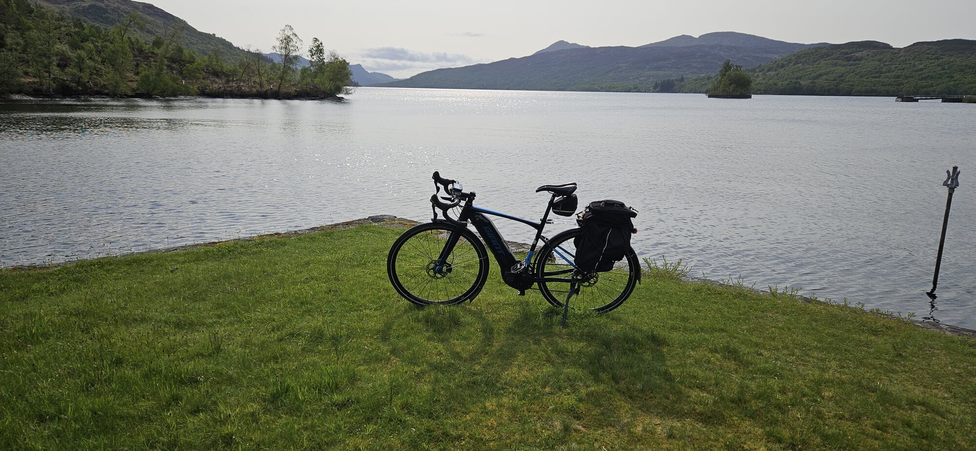 From there I took the low road to Strathblane, avoiding the Campsie Hills which would have taken a lot out of my first battery! At Strathblane I joined the main A81 north to Aberfoyle, this was the reason for leaving so early as I avoided all the traffic! This road is so much fun to ride as it involves lots of descents with the odd climb, there are some rough parts but most of it is in very good condition and I soon arrived in Aberfoyle! At Aberfoyle you have the option to take the big climb over the Dukes Pass or the narrow back road to Stronachlachar, after last weeks 112 mile ride and a 50 miler 3 days ago I wasn't keen on doing big climbs! So it was the quiet back road which is a bit lumpy but way easier than the pass! The best thing about this road is it passes many lochs and they were looking pretty amazing in the sun today!