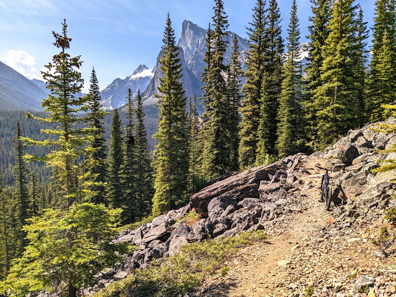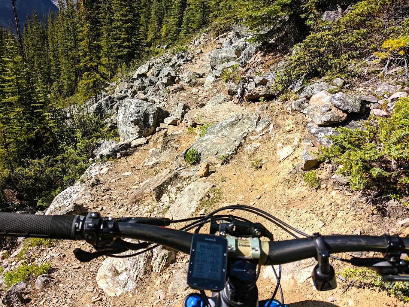 I was so stoked to ride this single track as I felt that the type of terrain was right in my wheelhouse. Much of my own local trails are strewn with roots and rocks so it was it was of little surprise to me that the gnarly conditions were similar with one major difference. The technical climb up from the beginning of the trailhead from the Moraine Lake Road was pretty intense. It went on for over 7km and so I was somewhat relieved to get it out of the way. The ride started out as fairly benign but that all changed once I passed the first trail marker.