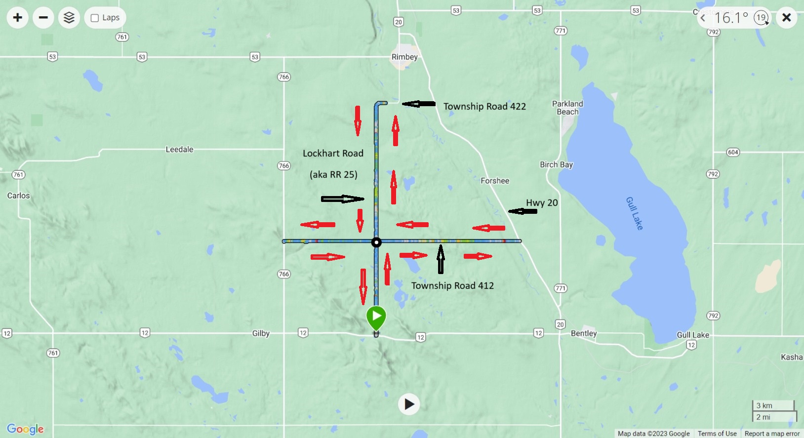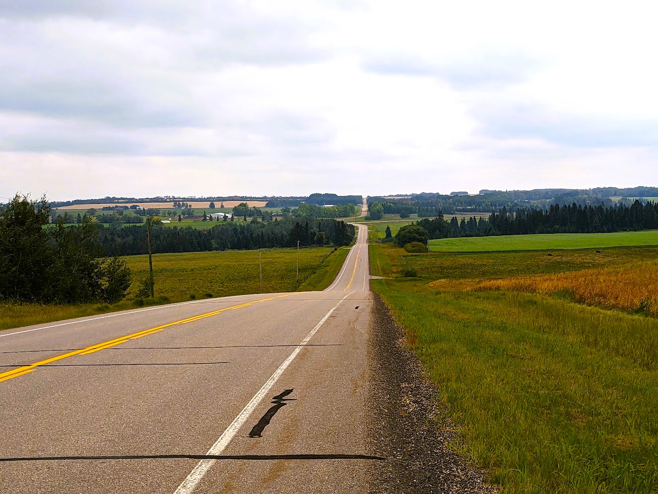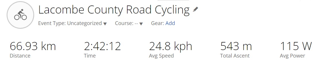 Today, we would take a page out of the Central Alberta Bicycle Club’s log book and drive 60 km northwest nearby the townships of Bentley and Rimbey to the location of one of their spring training courses. Only known as the Lockhart Road Race, this 66 km ride started for us near Hwy 12 but when it comes to choosing which direction to approach it, riders have several flavors to select from. We opted to ride it in a counterclockwise direction starting at RR 25 (Lockhart Road) and Hwy 12.