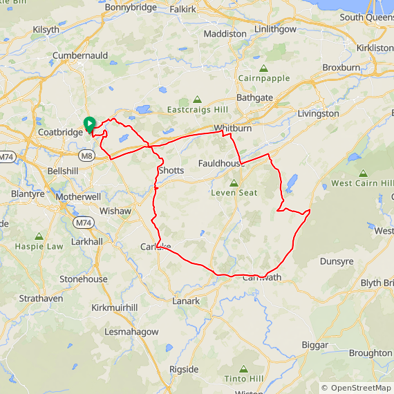 When I reached Kirk of Shotts I turned north over the big climb up past the Blackhill transmitter, I also used this road on Sunday as its such a fun road with almost no traffic! After the big climb the descents are just awesome, pretty much all the way down into the village of Plains where I would turn west again with only a few miles to home now! When I arrived in my home town I had covered 59 miles so I decided to take a tour around town and make it a metric century! I was amazed I managed to get home dry today, what a brilliant day that was!