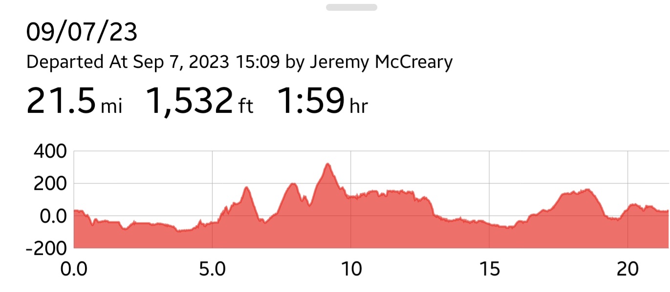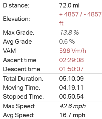 Yesterday, I took one of my bigger rides to date — a hilly inland route to a geologic POI I've been eager to explore (photos coming soon). Grades of up to 15%, mostly at PAS 1/9 and 2/9, with a blazing average moving speed of 11 mph.