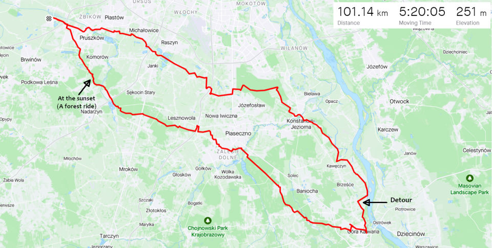 The first part of the ride was actually slightly boring. Komoot directed me to ride in the Kabacki Forest, and also told me to take the classic gravel/MTB route towards Konstancin-Jeziorna. It was a cold day initially, so I was wearing my most advanced Bioracer cycling jacket with detachable sleeves.