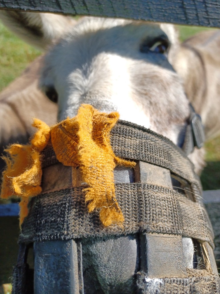 This farm had four residents in its front field: one horse and three tiny donkeys. The three long eared inhabitants were dressed in Hannibal Lector masks of varying cleanliness and cobbling together, the sole purpose being to thwart the little beasts of burden from eating too much of the rich grass. Not for a weight gain issue, but for a hoof ailment called laminitus- a severe swelling and debilitating issue that, if contracted and not immediately resolved via medication or veterinary intervention, could be fatal. Can't tell the little guys that fact as they would neither believe, or understand, the danger. After all, grass is their food source. However, genetically not in the quantity or lushness offered underfoot. Donkey are desert bred creatures who survive under the toughest of conditions with a sparce food source. Yet...here they are in Virginia with grass rich enough to kill them 100 times over. Hence the masks.