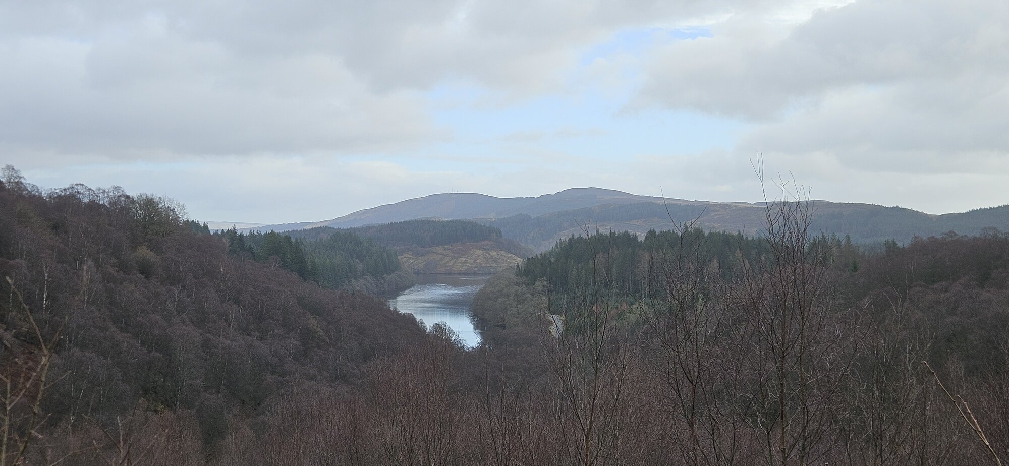 Now it was time to enjoy the descent, the road is pretty rough though so I had to be careful. I stopped for this photo looking across the River Carron where I would be riding a short time later on the road down into Denny. This is the road I use regularly when passing the Carron Valley Reservoir. I changed to my 3rd battery here with almost 80 miles covered.