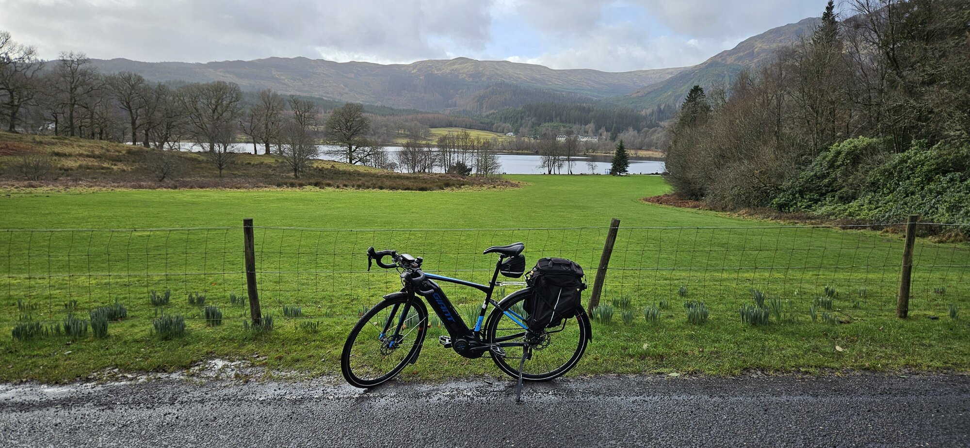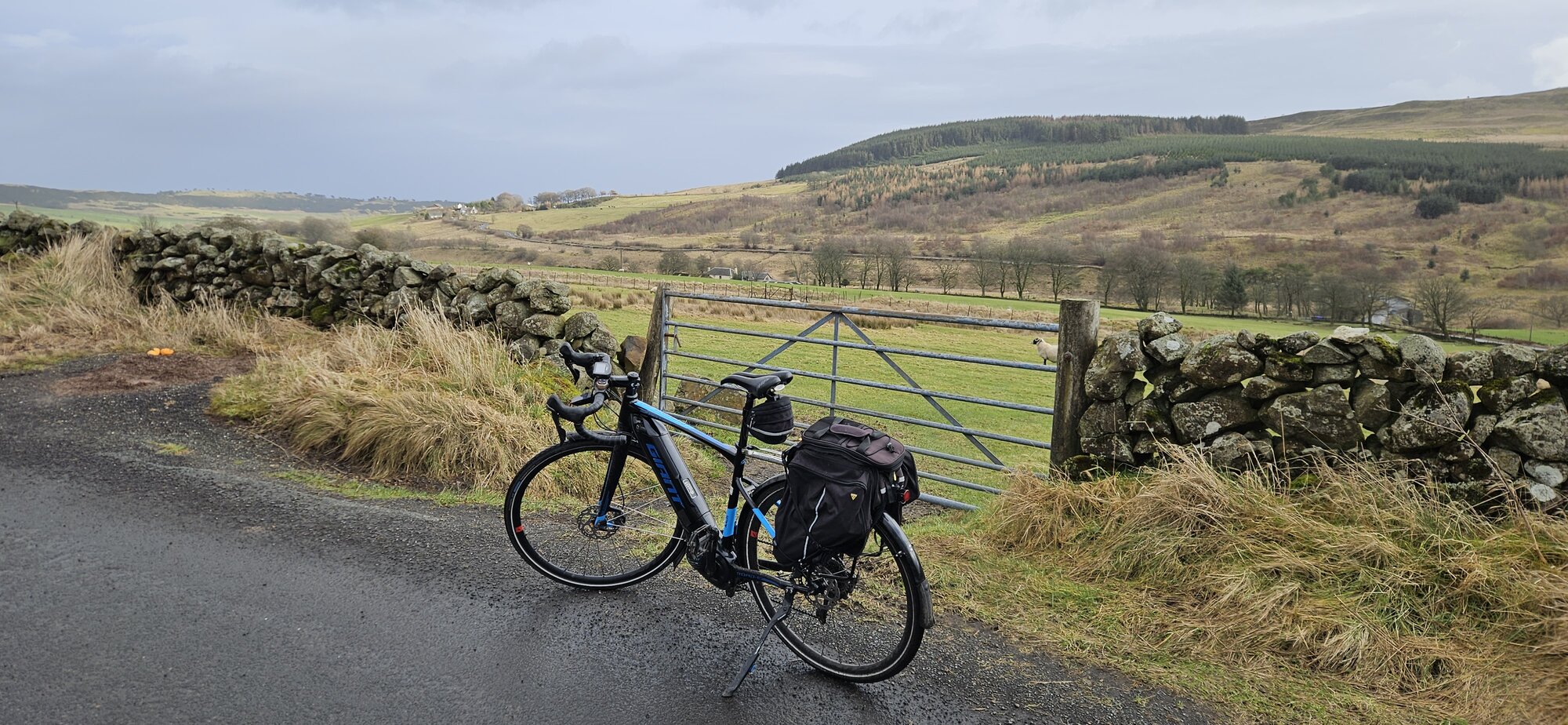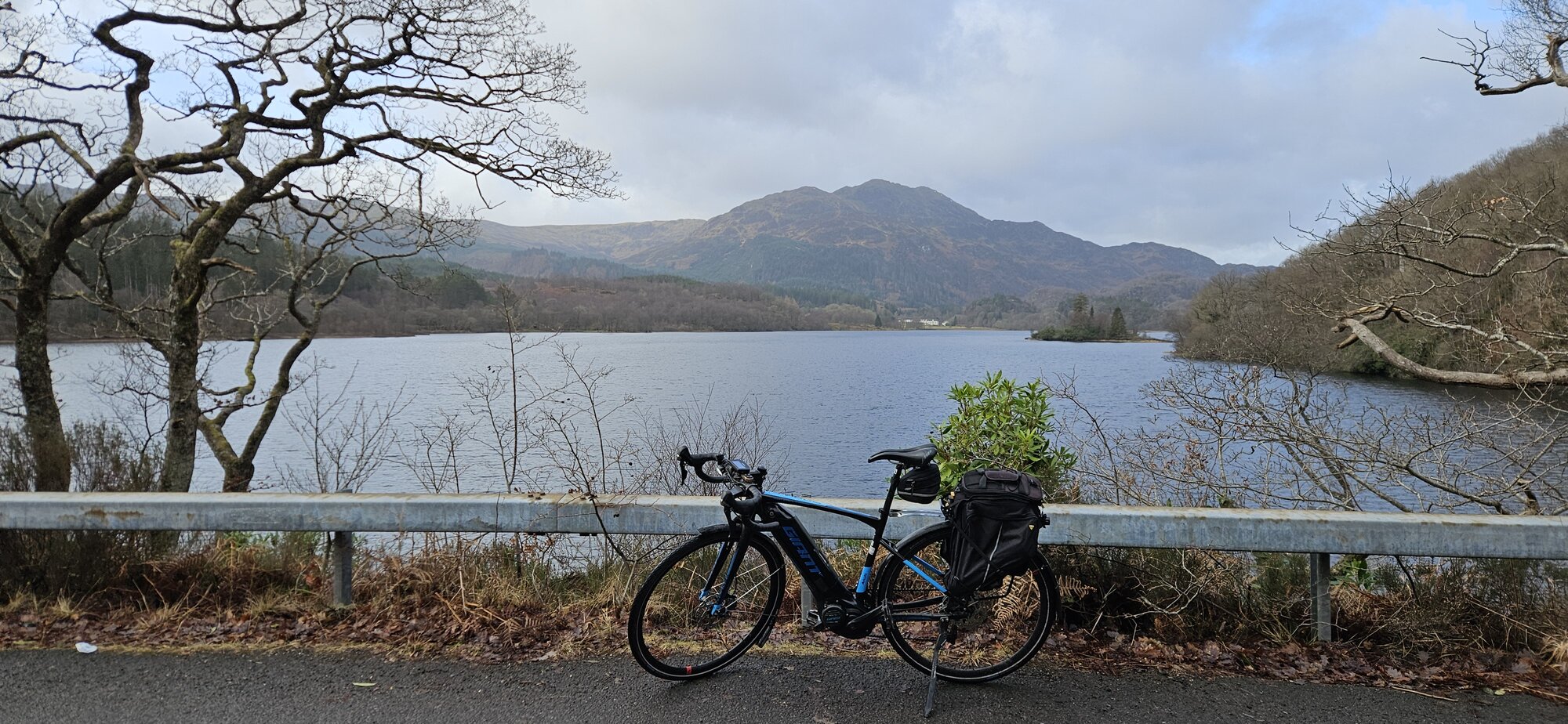 I arrived in Aberfoyle and it was time to start the climb over the Dukes Pass, my summit software reported a climb of 2.5 miles with an average gradient of 5.7%. The start of the climb is very steep and has quite a few switchbacks, thankfully the rain was holding off on the way up and as I crested the steep part of the climb the road flattens for a bit. I stopped here to change to my second battery with 40 miles covered, I started with my original battery which is almost 6 years old now and still doing a good job.