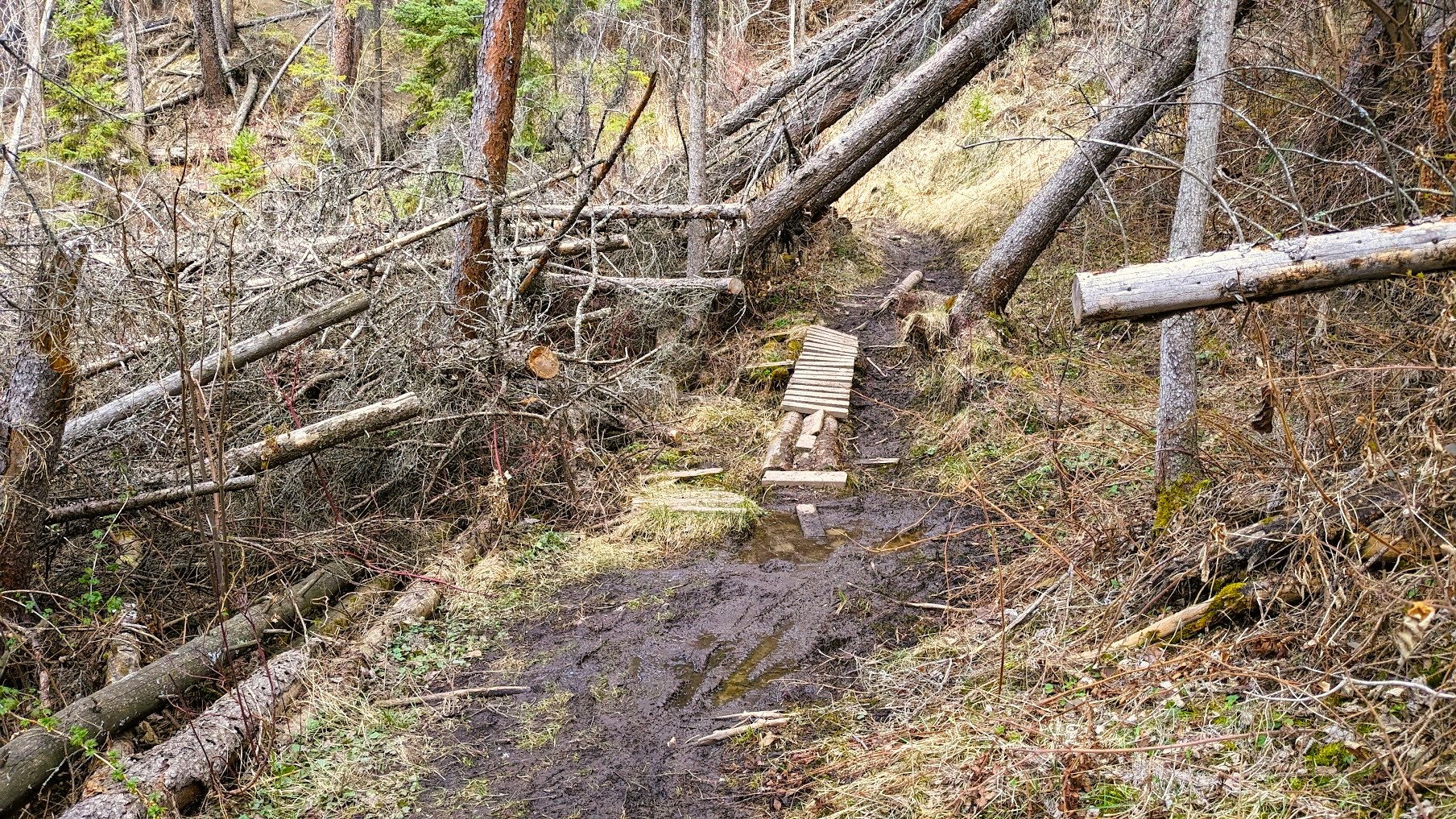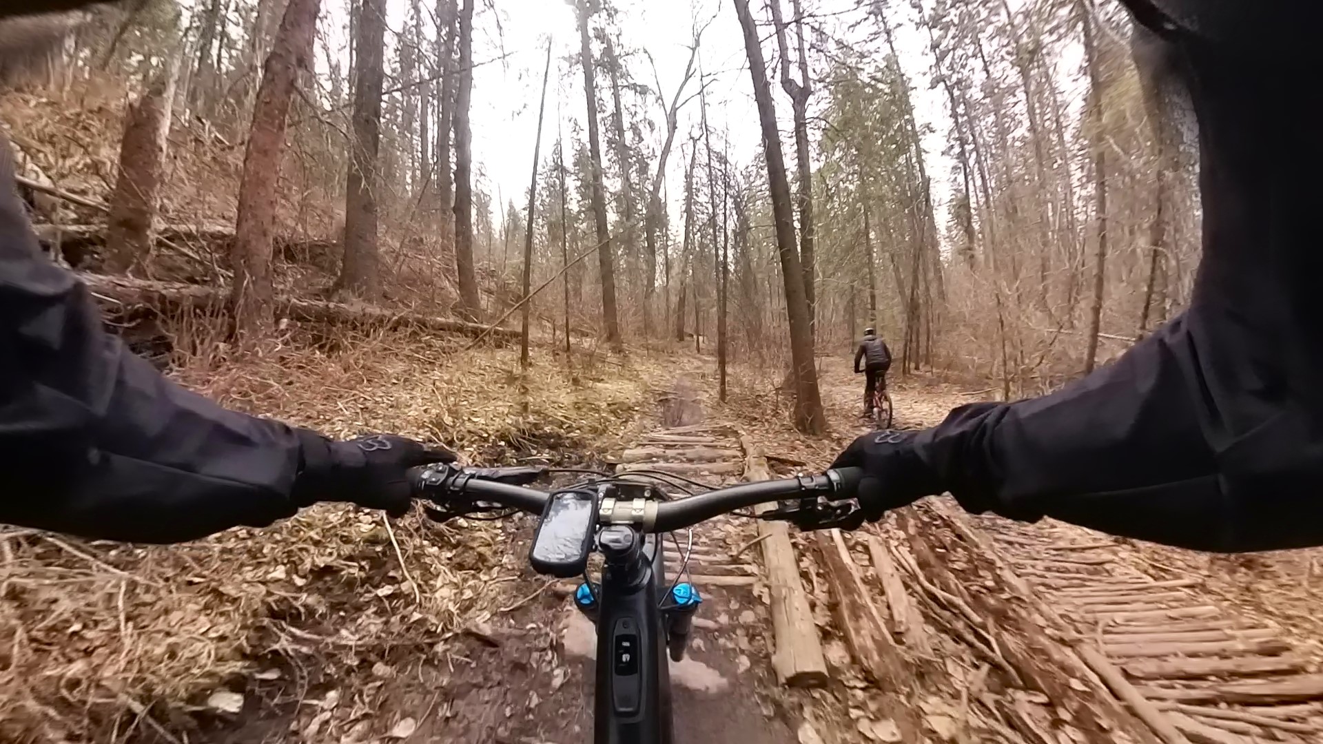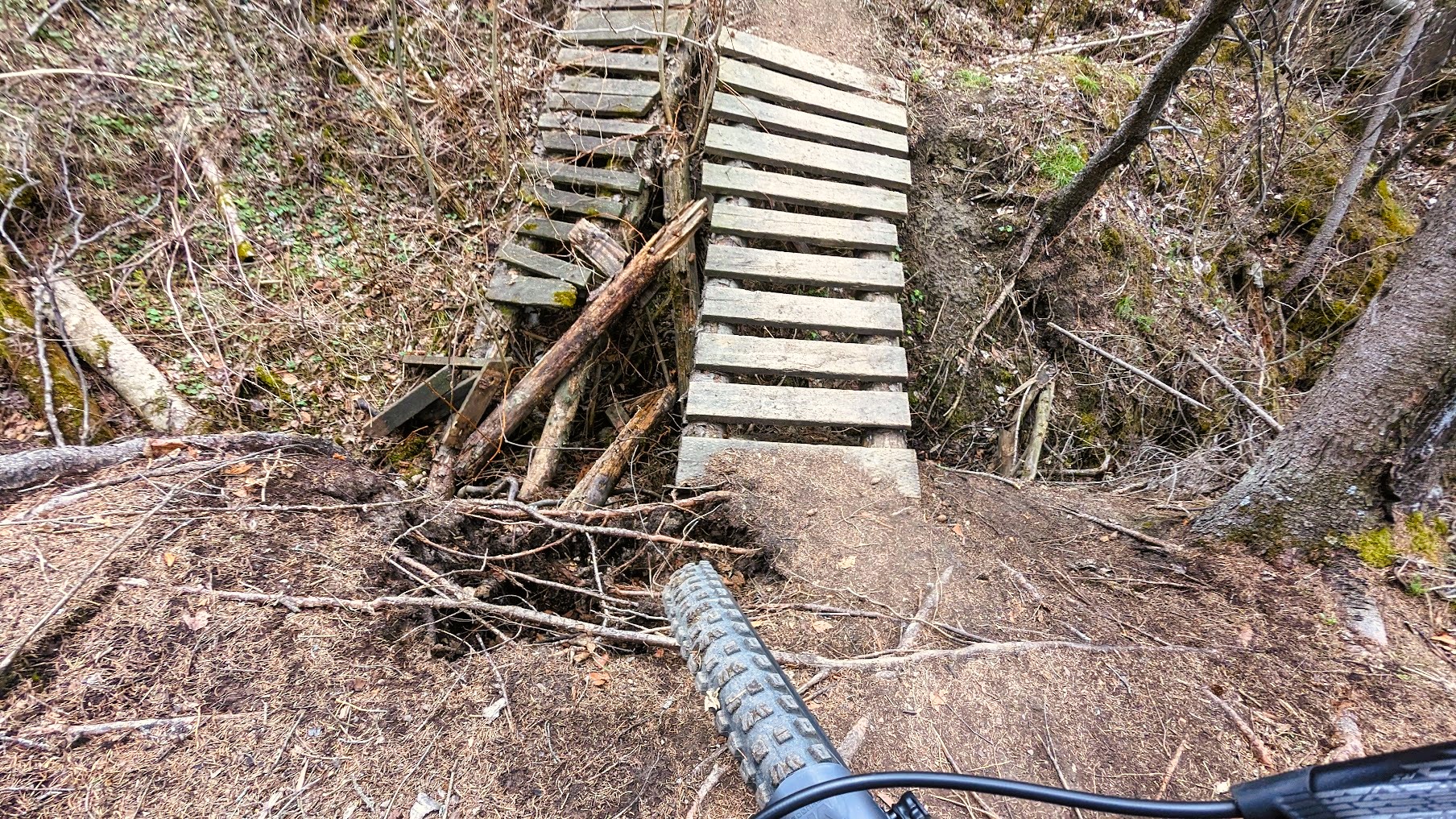 I rode two usual trails followed up by a gnarly DH section called the Phoenix. It branches off less than a kilometer in from the Bench single. Conditions were good with the exception of the Phoenix which likely doesn’t see much traffic as it’s not what I would consider much of a flowy trail due to the number of exposed roots and TTFs. I don’t believe the rudimentary structures were constructed with anything else in mind other than to keep folks suspended above the water table and to simply have them complete the run. I rode the Phoenix last season in the opposite direction and seemed like it was in better shape then.