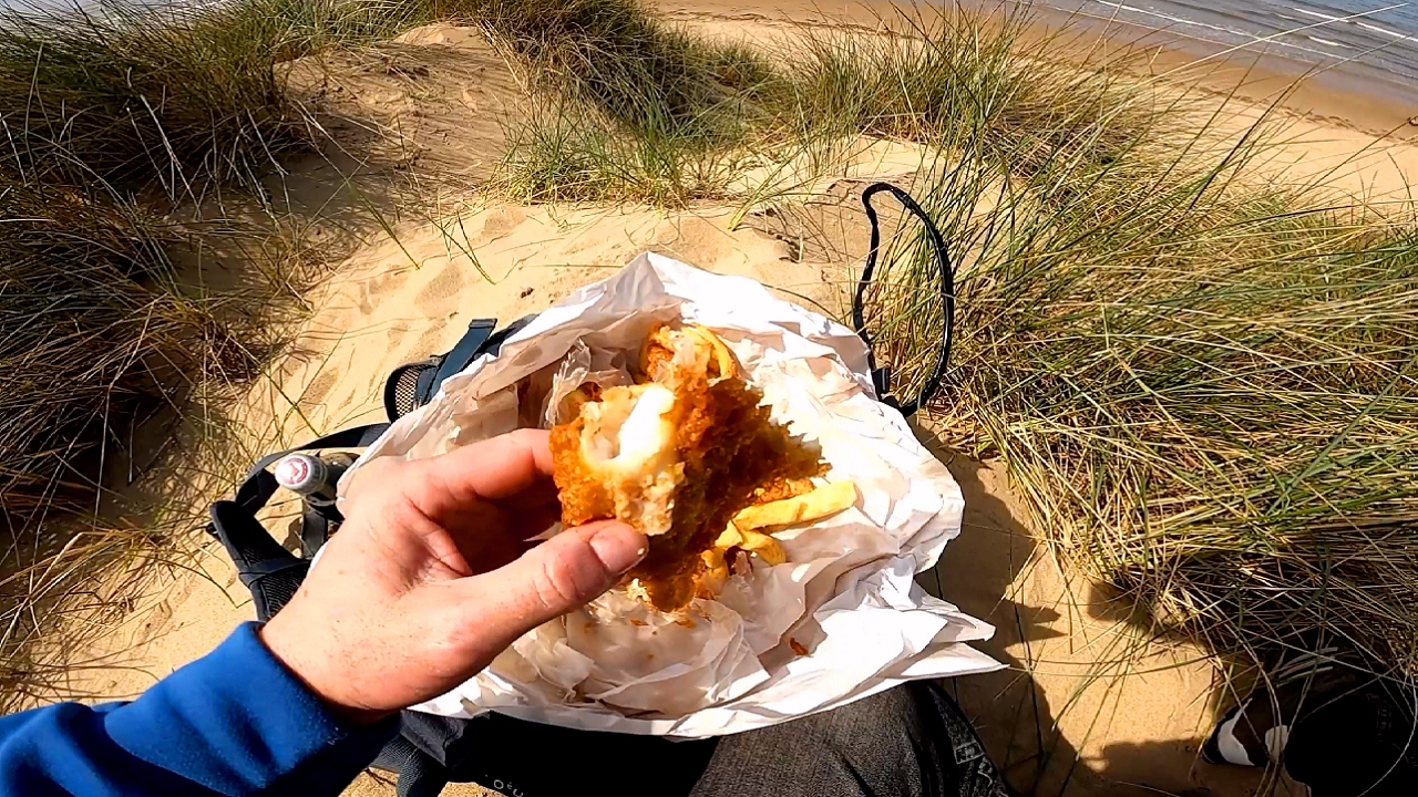 The usual, fish and chips on a tall dune, not a hint of wind, so no crunchy teeth.
