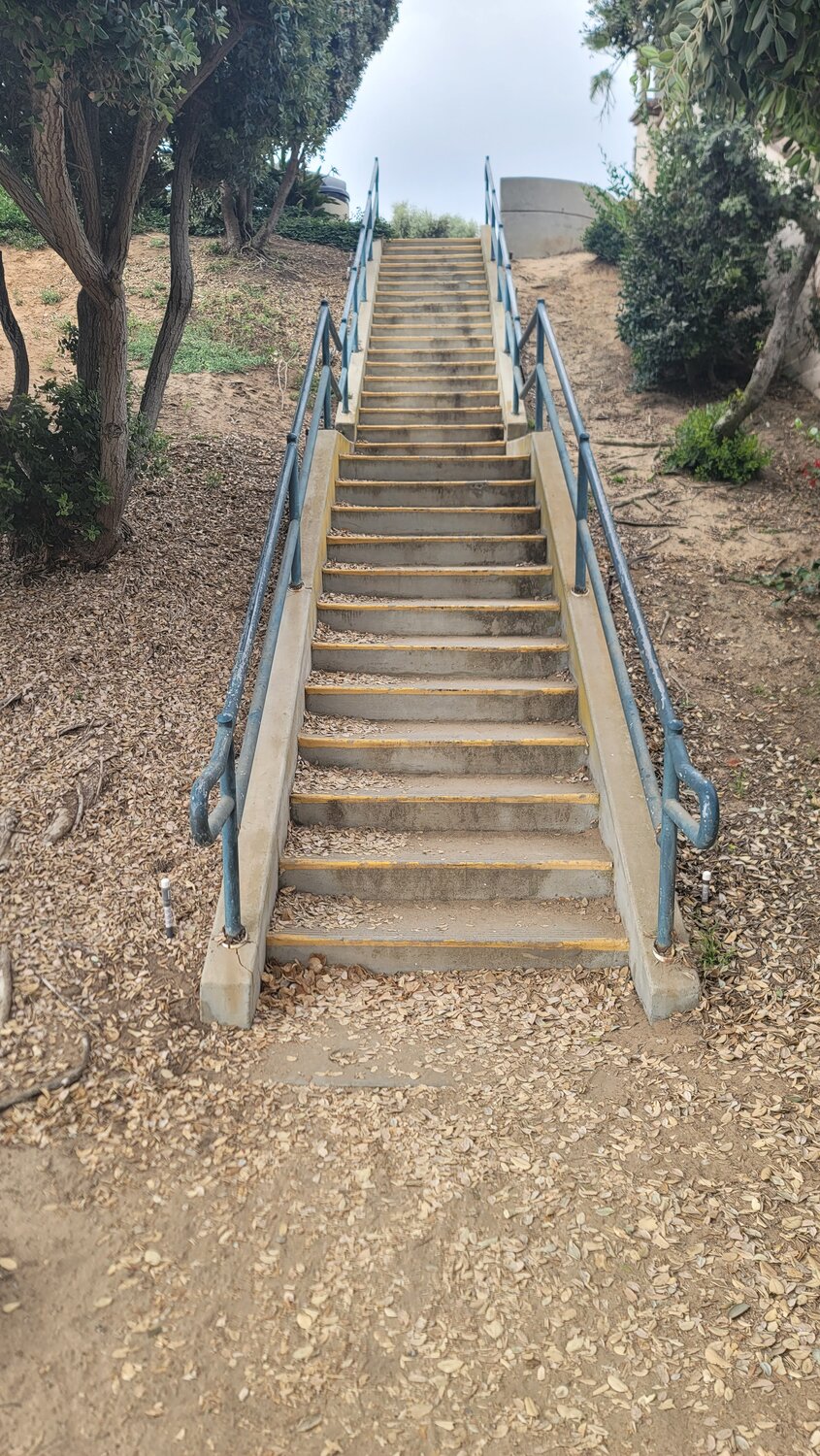 On this (east) side of the tracks, you have to get over these stairs to get past the Avenida Encinas rail bridge. No way with my heavy hub-drive, but carrying the lightweight SL over was no problem.